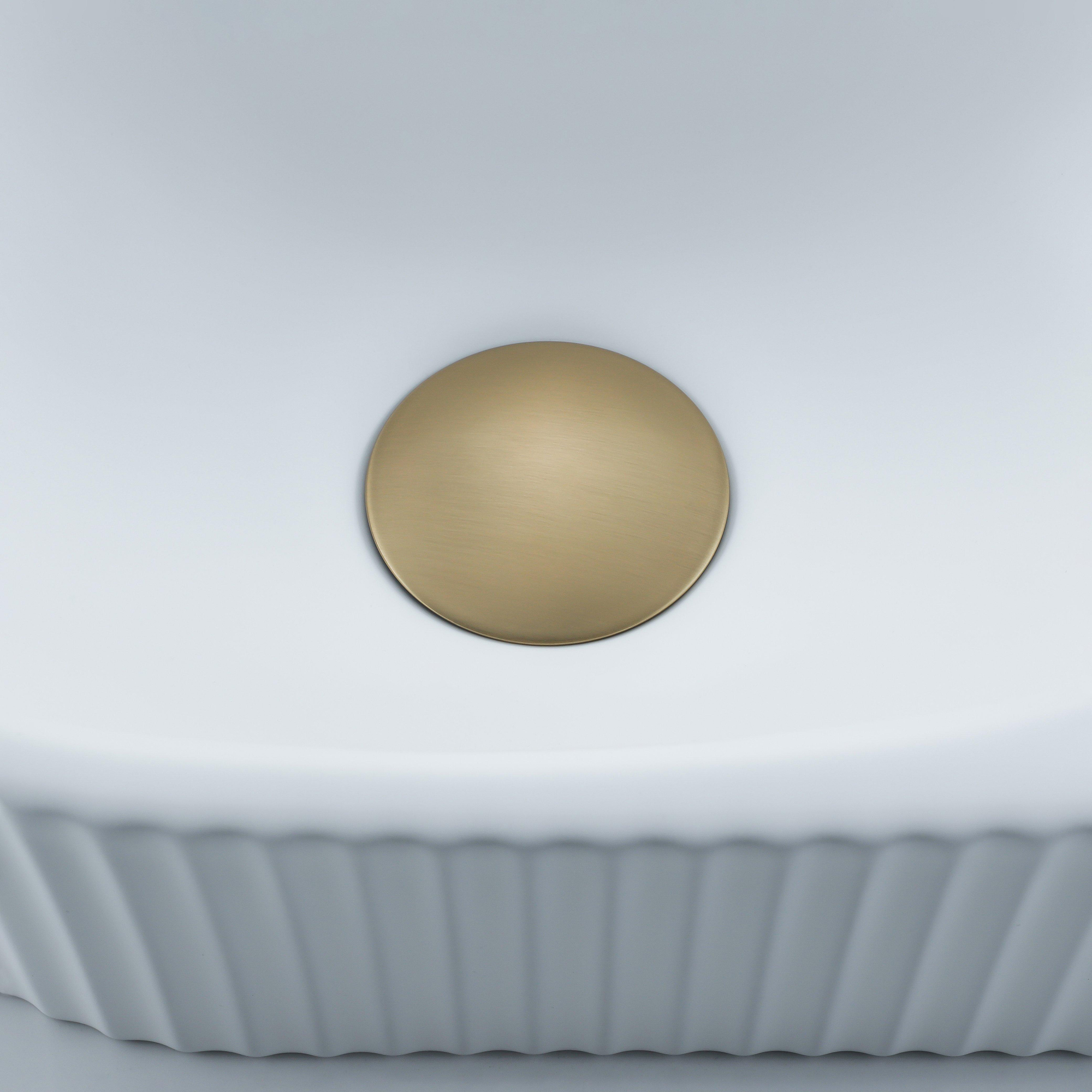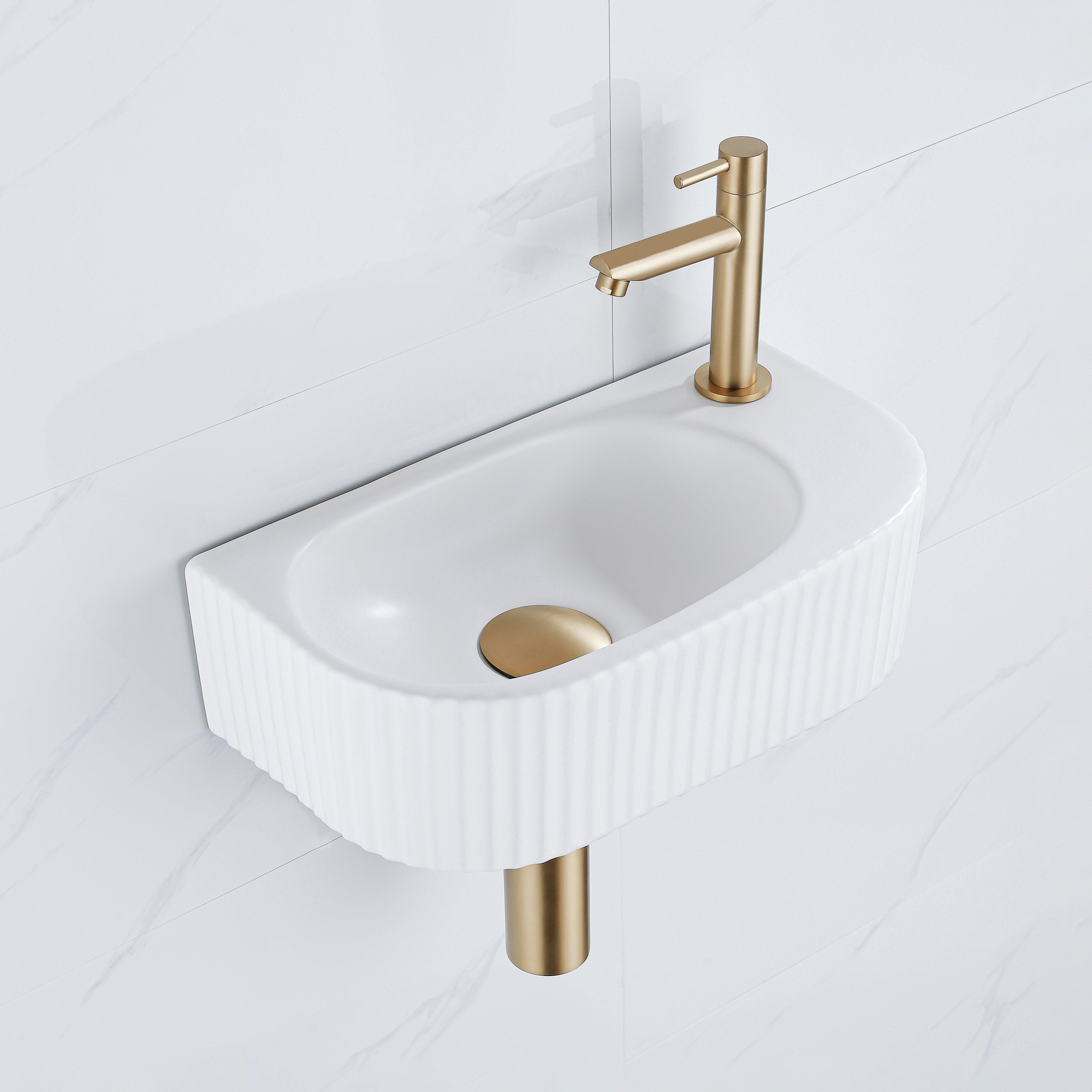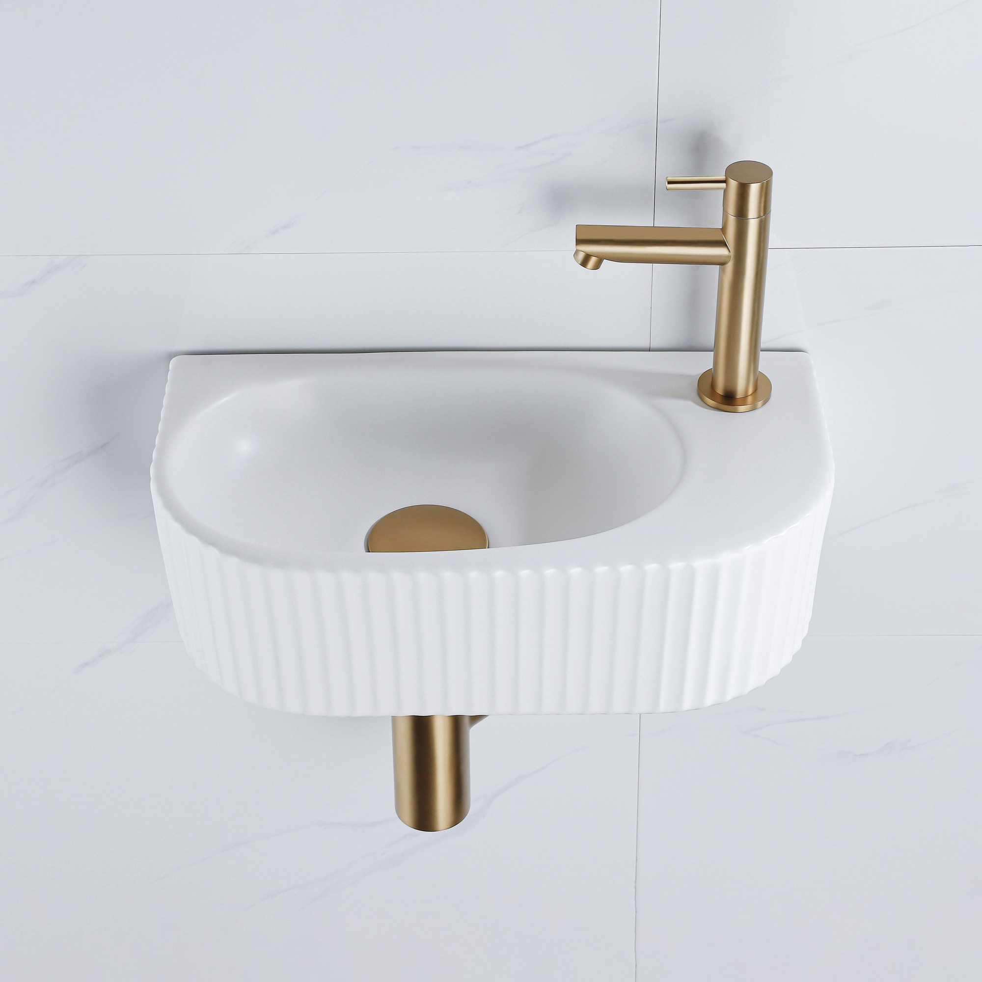 Fugaflow Efficiente Pietra Fonteinset - 40x21.5x12cm - rechts - geribbeld - halfrond - 1 kraangat - keramiek - fonteinkraan geborsteld messing - afvoerplug - verlaagd sifon - wit mat