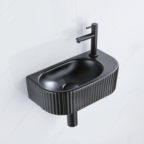 Fugaflow Efficiente Pietra Fonteinset - 40x21.5x12cm - rechts - geribbeld - halfrond - 1 kraangat - keramiek - fonteinkraan zwart mat - afvoerplug - verlaagd sifon - zwart mat