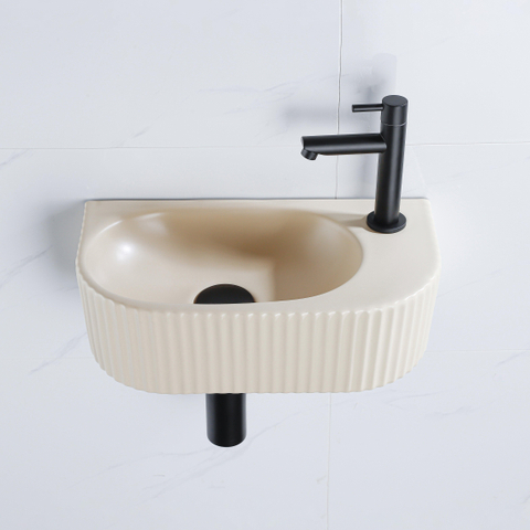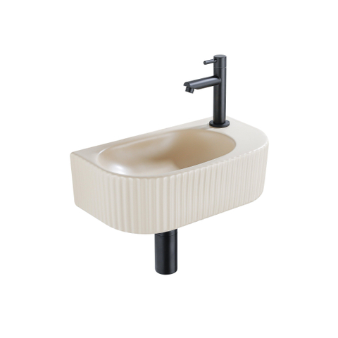 Fugaflow Efficiente Pietra Fonteinset - 40x21.5x12cm - rechts - geribbeld - halfrond - 1 kraangat - keramiek - fonteinkraan zwart mat - afvoerplug - verlaagd sifon - beige
