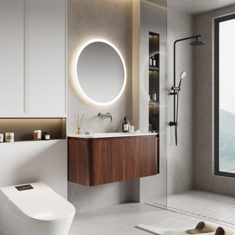 Het warme kastanjekleurige hout met een matte afwerking geeft dit meubel een tijdloze en natuurlijke uitstraling. De afgeronde hoeken zorgen voor een zachte, elegante vorm die perfect aansluit bij moderne en klassieke badkamers. Door het minimalistische design met geïntegreerde grepen blijft het meubel strak en overzichtelijk, wat bijdraagt aan een rustige sfeer. Zo voeg je een stijlvol element toe dat direct de aandacht trekt en jouw badkamer een luxe uitstraling geeft.