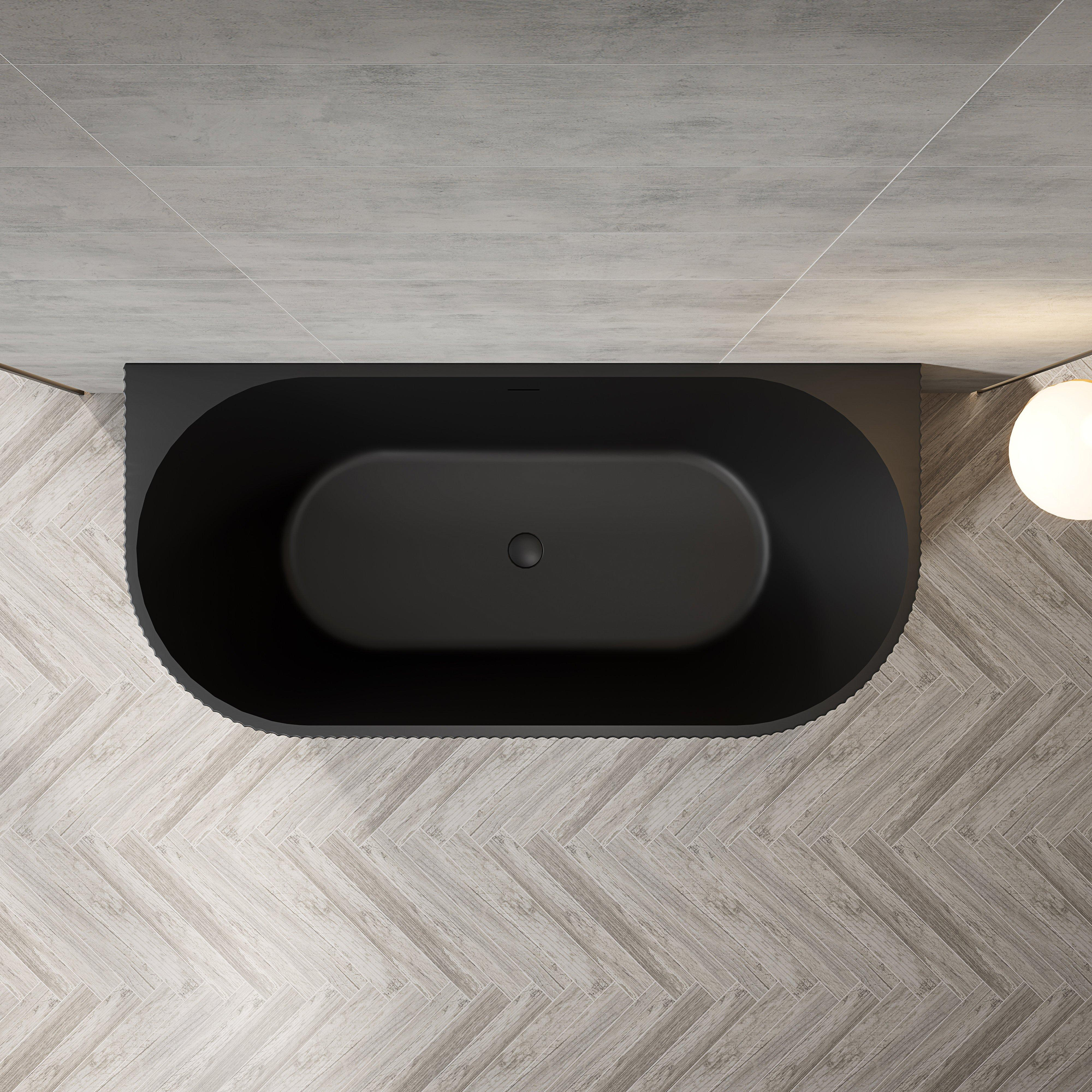 De matzwarte kleur en het half vrijstaande ontwerp maken dit bad tot een echte eyecatcher in elke badkamer. Het strakke, rechthoekige silhouet met een ovale binnenvorm zorgt voor een moderne en tijdloze uitstraling. De ribbelstructuur geeft het bad een uniek en verfijnd detail, waardoor het zich onderscheidt van standaard baden. Door deze stijlvolle kenmerken voeg je direct sfeer en elegantie toe aan jouw badkamer, wat een gevoel van luxe en comfort creëert.