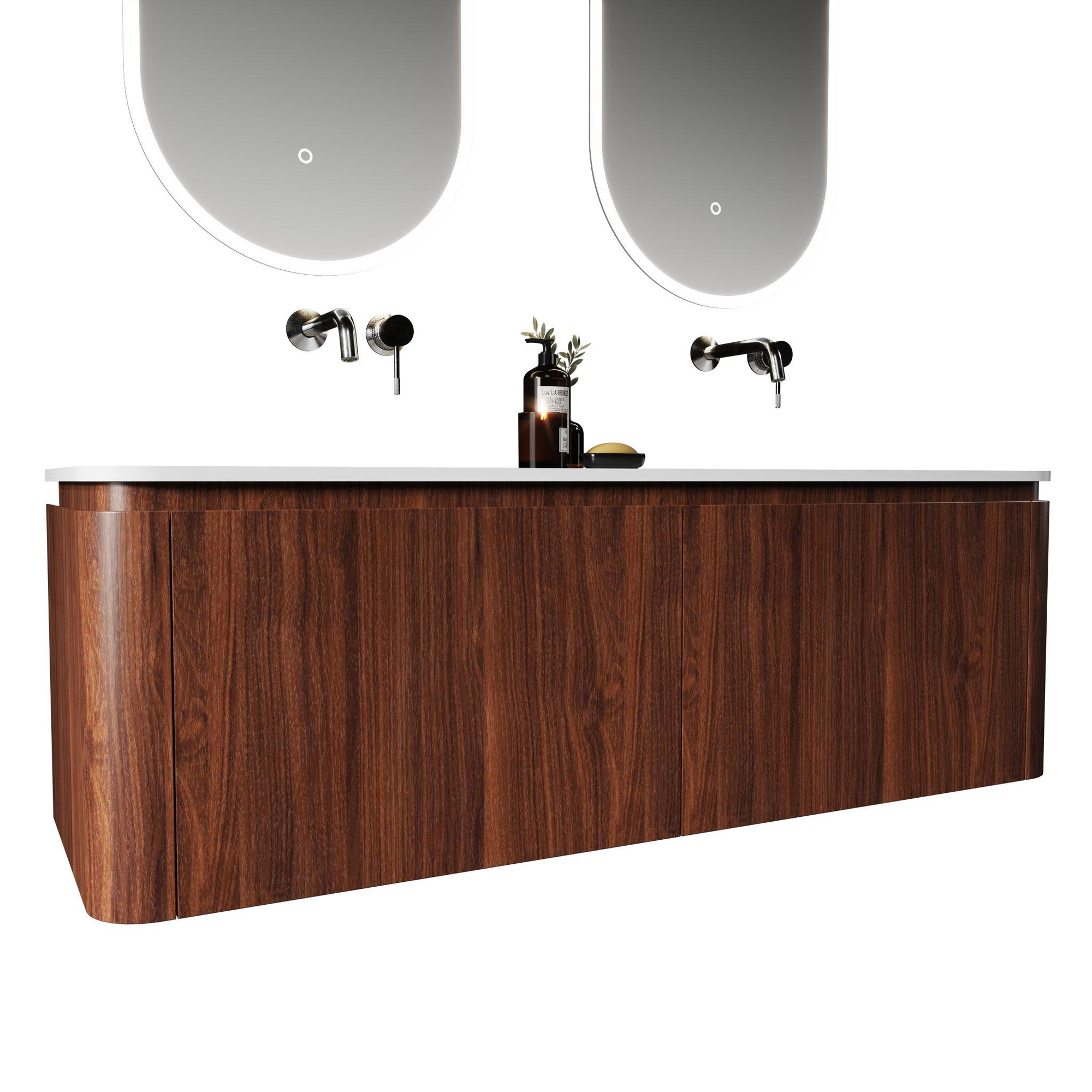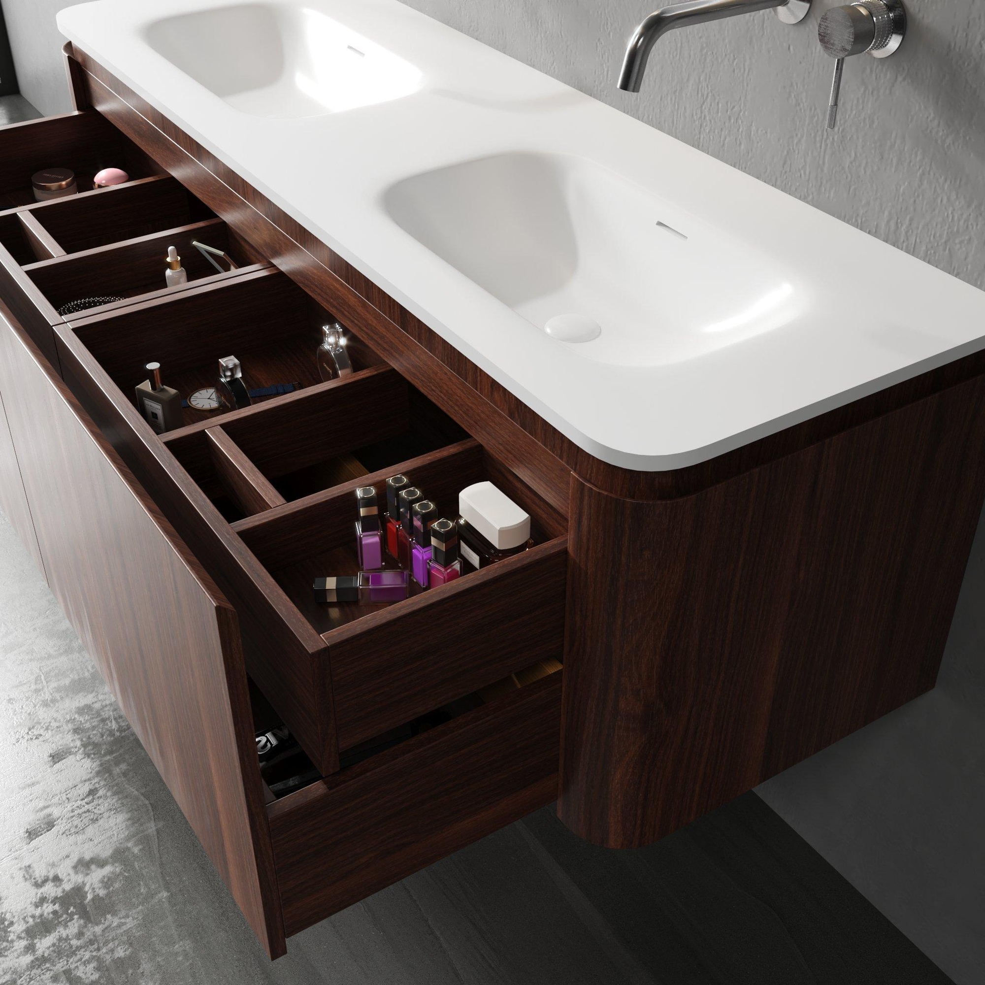 Deze prachtige wastafelonderkast transformeert jouw badkamer in een oase van rust en functionaliteit. Met zijn warme kastanjekleurige afwerking in walnoot en het strakke, matte oppervlak voeg je direct een vleugje natuurlijke elegantie toe. De combinatie van twee ruime wasbakken en vier handige lades biedt niet alleen volop opbergruimte, maar maakt ook het dagelijkse gebruik een stuk aangenamer. Dankzij het solide solid surface materiaal van het wastafelblad geniet je van een duurzaam en gemakkelijk te reinigen oppervlak dat bestand is tegen de uitdagingen van een druk huishouden. De afgeronde hoeken zorgen voor een zachte uitstraling en verhogen de veiligheid, terwijl het ontbreken van kraangaten je de vrijheid geeft om zelf de ideale kraan te kiezen die past bij jouw stijl en wensen. Dit meubel is een perfecte balans tussen design en praktische bruikbaarheid, waardoor jouw badkamer niet alleen mooi oogt, maar ook optimaal functioneert.