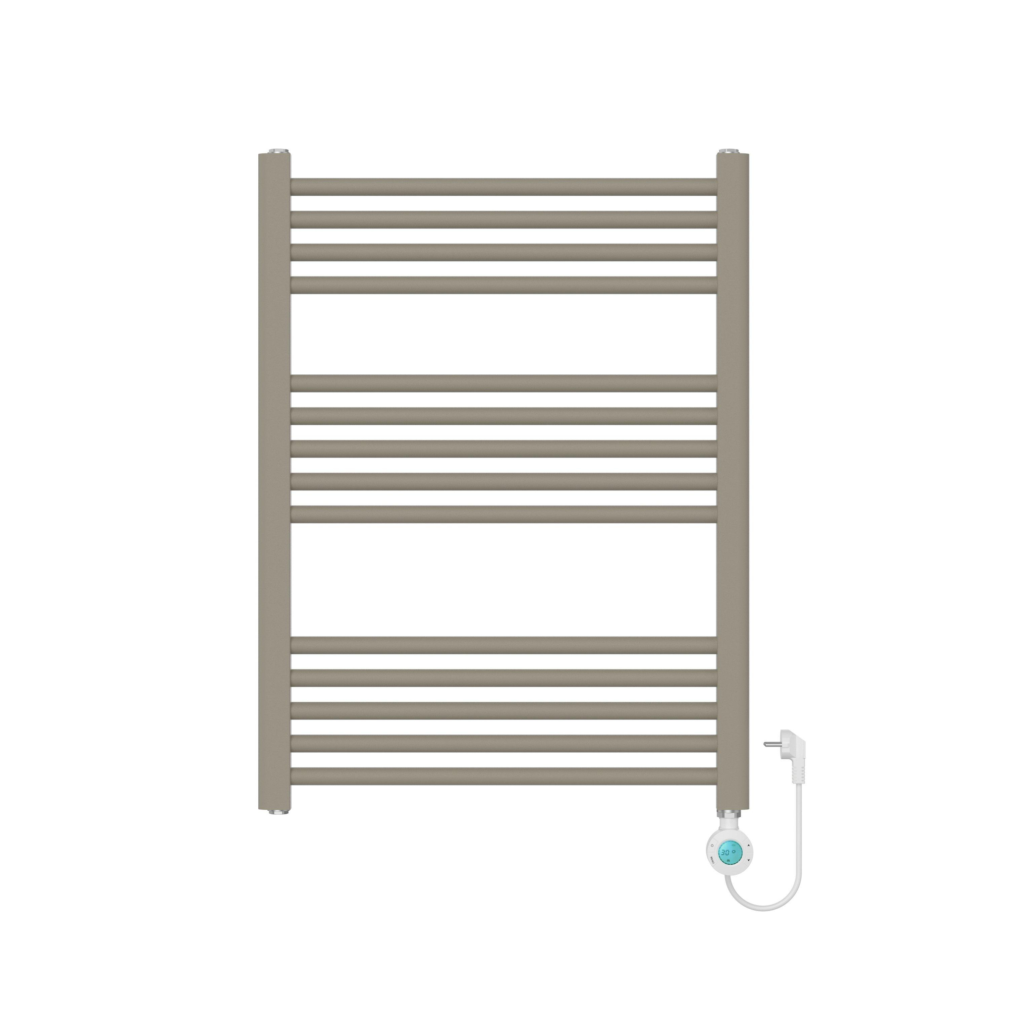 Ben je op zoek naar comfortabele warmte in de badkamer zonder gedoe met de cv-installatie, maar wil je tegelijk een strakke en stijlvolle uitstraling behouden? Dan is een compacte elektrische handdoekradiator in taupe een slimme keuze. Met zijn horizontale opstelling en afmeting van 80x60 cm past dit model perfect in kleine tot middelgrote badkamers, toiletruimtes of bij de wasruimte, waar je net dat beetje extra warmte en comfort wenst. De 400 watt zorgt voor aangename bijverwarming en lekker droge handdoeken, zonder dat het energieverbruik onnodig hoog wordt. Dankzij de matte afwerking in een warme taupetint combineer je hem moeiteloos met moderne tegels, natuurlijke materialen en andere badkamerkleuren. Ideaal als je jouw ruimte een rustgevende, eigentijdse uitstraling wilt geven én wilt genieten van het gemak van een elektrische radiator met stekker.