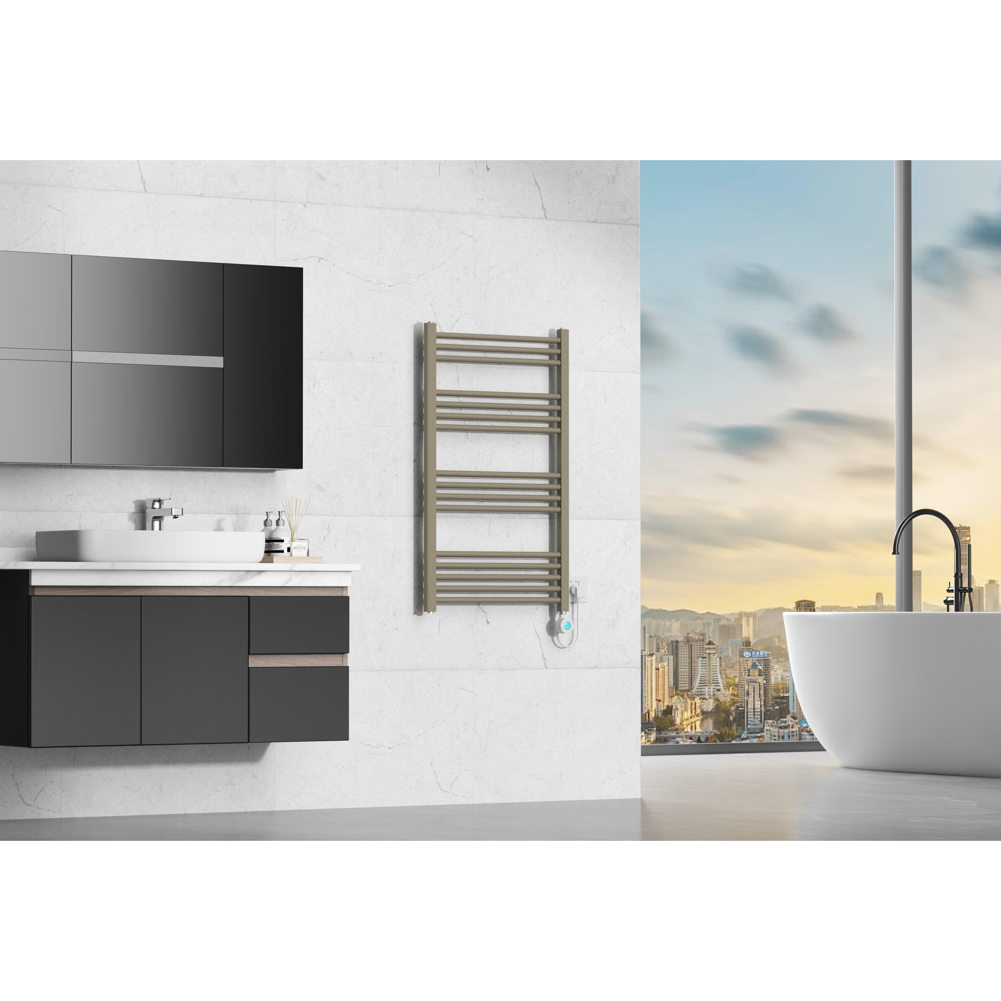 - Elektrische handdoekradiator, ideaal als bijverwarming in de badkamer of hoofdverwarming in kleinere ruimtes.