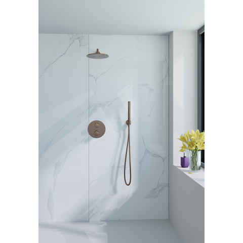Geniet van een luxe douche-ervaring met de FugaFlow Eccelente Acces inbouw Regendoucheset in een stijlvolle geborsteld koperen PVD afwerking. Deze set beschikt over een ronde 25cm hoofddouche en een praktische staaf handdouche, gecombineerd met een thermostatische kraan die zorgt voor een constante en comfortabele watertemperatuur.