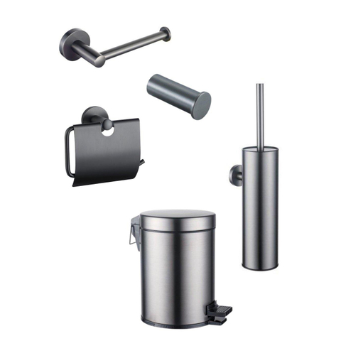 FugaFlow Eccelente Acces Toiletset 5-delig - toiletrolhouder - reserverolhouder - toiletborstelhouder - handdoekhaak - pedaalemmer - Geborsteld Gunmetal PVD