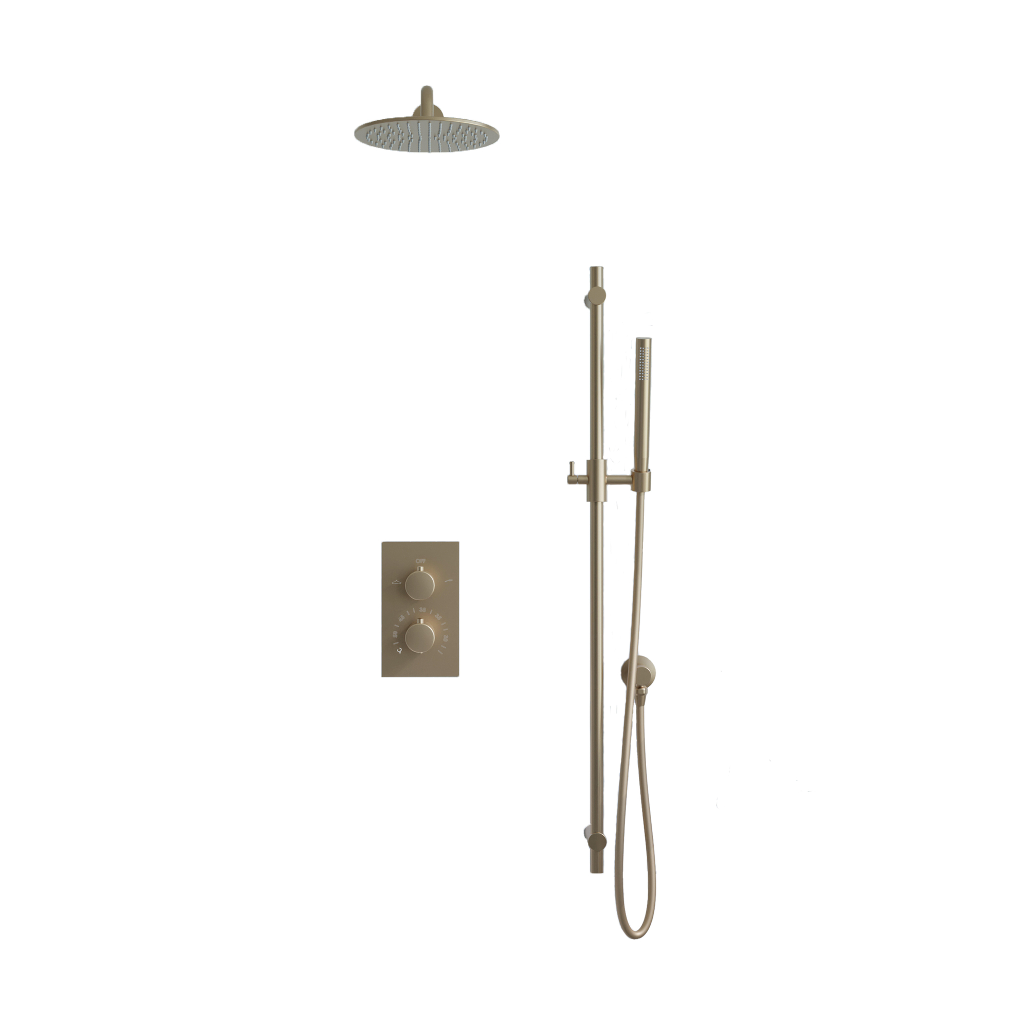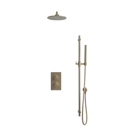 De FugaFlow Eccelente Acces Inbouw Regendoucheset combineert luxe en functionaliteit voor een ultieme douche-ervaring. Met een thermostatische kraan, een royale 25cm hoofddouche, een staaf handdouche, wandarm en glijstang in een stijlvolle geborsteld messing PVD (gouden) afwerking, geniet je van comfort en elegantie in jouw badkamer.