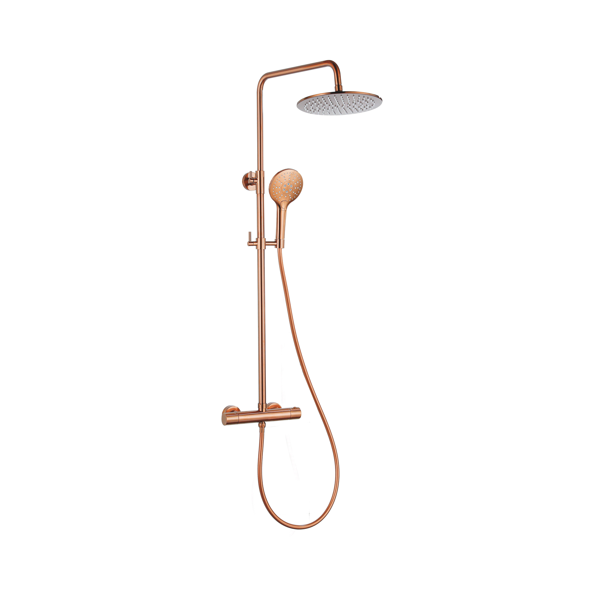 De FugaFlow Eccelente Acces Regendoucheset in geborsteld koper PVD is een stijlvolle en duurzame toevoeging aan je badkamer. Met een royale 25cm hoofddouche, een ronde handdouche en een gladde slang geniet je van een ontspannen en luxe douche-ervaring. Dankzij de thermostatische regeling blijft de watertemperatuur constant voor optimaal comfort.