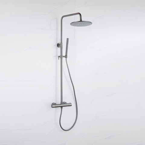 De FugaFlow Eccelente Acces Regendoucheset met thermostaat zorgt voor een luxe en comfortabele douche-ervaring. Met een royale 25cm hoofddouche, een gladde slang en een stijlvolle staaf handdouche in geborsteld Gunmetal PVD, combineert deze set modern design met gebruiksgemak.