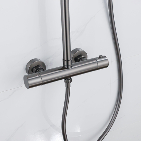 De FugaFlow Eccelente Acces Regendoucheset in geborsteld Gunmetal PVD is een stijlvolle en moderne toevoeging aan jouw badkamer. Met een royale 30cm ronde hoofddouche, een gladde slang en een ronde handdouche geniet je van een comfortabele en luxe douche-ervaring. Dankzij de thermostatische regeling heb je altijd de perfecte watertemperatuur.
