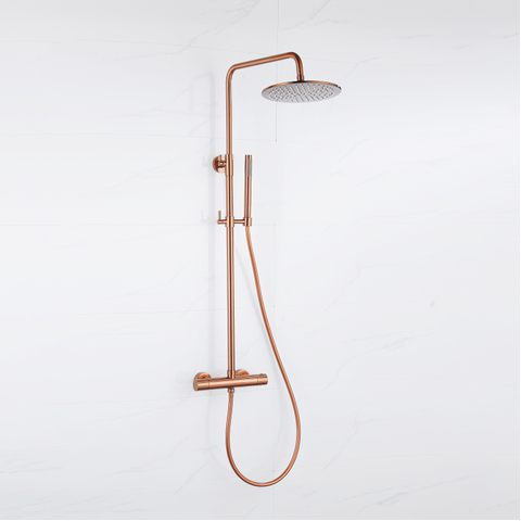 De FugaFlow Eccelente Acces Regendoucheset in geborsteld koper PVD combineert stijl en comfort in jouw badkamer. Met een royale 30cm hoofddouche, een gladde slang en een staaf handdouche geniet je van een luxe en ontspannende douche-ervaring. Dankzij de thermostatische regeling blijft de watertemperatuur altijd perfect op jouw gewenste niveau.