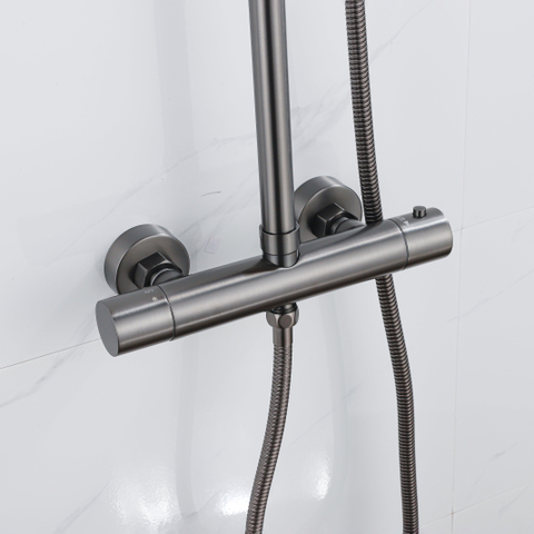 De FugaFlow Eccelente Acces Regendoucheset in geborsteld Gunmetal PVD combineert een modern design met hoogwaardige materialen. Met een royale 30cm hoofddouche en een ronde handdouche geniet je van een luxe en ontspannende douche-ervaring. Dankzij de thermostatische regeling blijft de watertemperatuur constant, wat zorgt voor extra comfort en veiligheid.