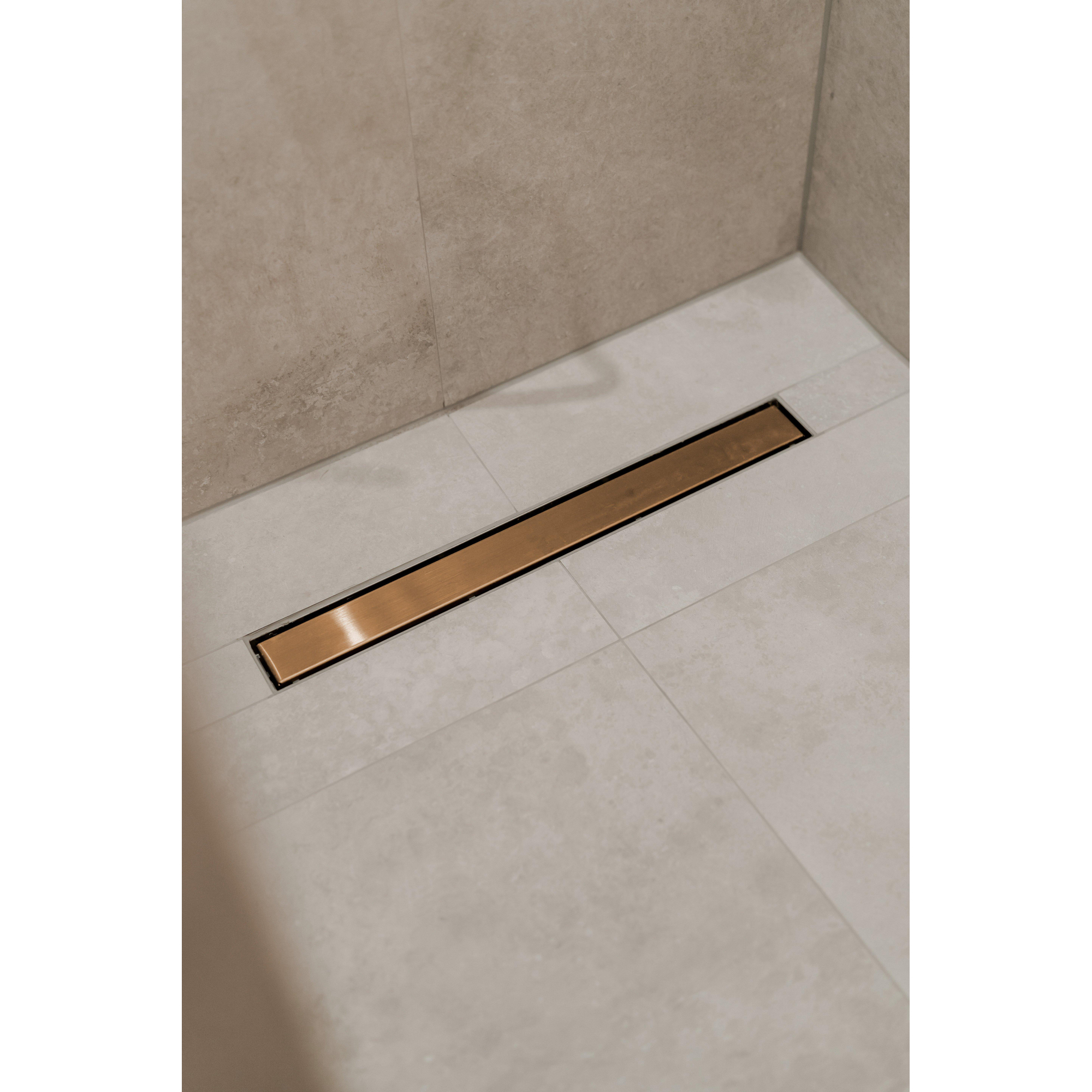 De FugaFlow Eccelente Anta douchegoot van 140 cm met gesloten rooster en vloerflens in geborsteld koper PVD is een stijlvolle en robuuste afvoeroplossing voor jouw badkamer. Dankzij het elegante design en de duurzame materialen zorgt deze douchegoot voor een luxe uitstraling en een efficiënte waterafvoer.
