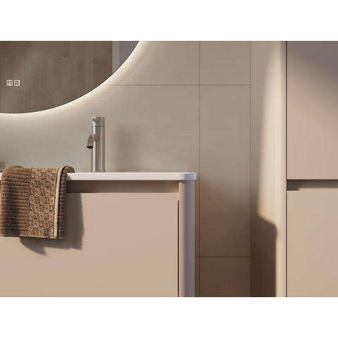 Het geïntegreerde wastafelblad van keramiek is een slimme keuze als je gaat voor gemak en hygiëne. Keramiek is hard, krasvast en goed bestand tegen dagelijks gebruik met water, zeep en cosmetica. Vlekken verwijder je eenvoudig met een mild reinigingsmiddel, zodat je wastafel er lang als nieuw blijft uitzien. Het meubel wordt aan de wand gemonteerd, waardoor je vloer vrij blijft en je daar makkelijk kunt schoonmaken. Het enkele kraangat geeft je de vrijheid om een mooie eenhendel wastafelkraan te kiezen die past bij jouw stijl. Doordat de onderkast is uitgevoerd in houtfineer profiteer je van de natuurlijke uitstraling van hout, terwijl het oppervlak beter bestand is tegen temperatuurverschillen en vocht in de badkamer.