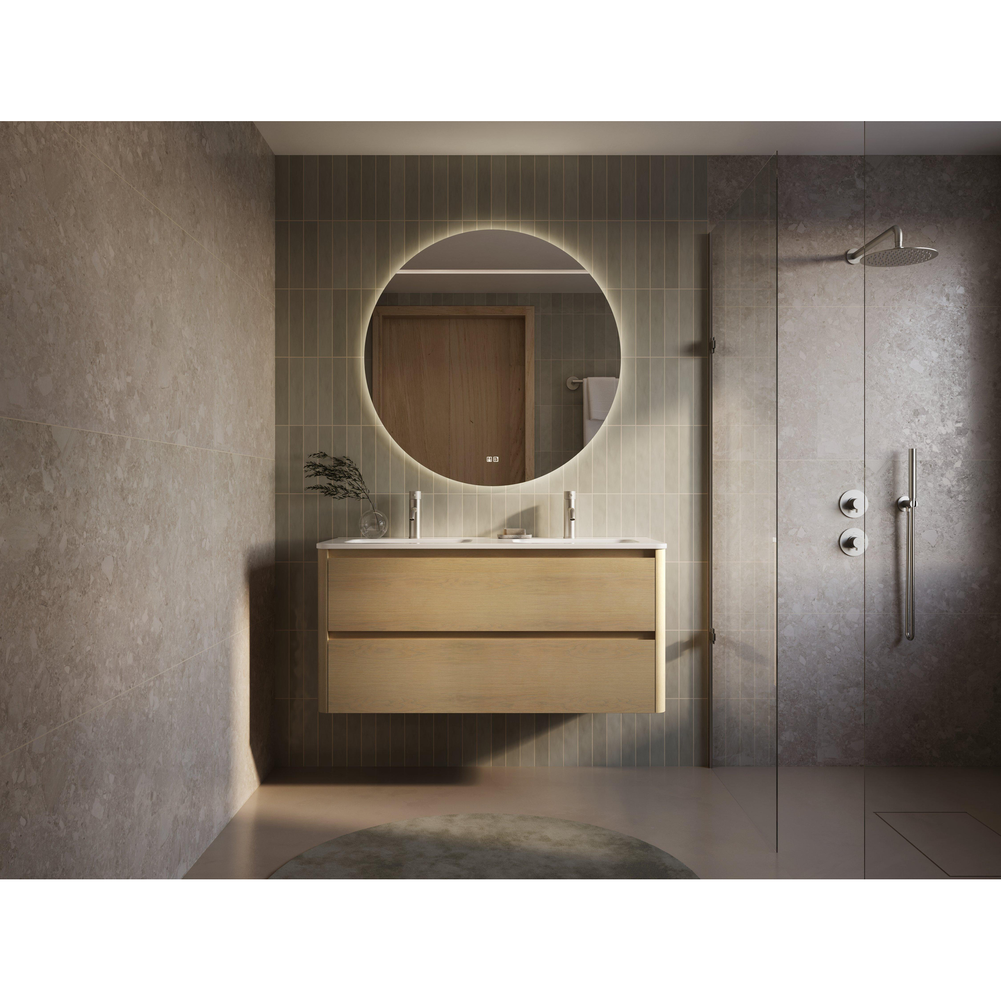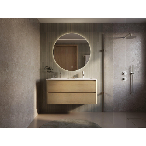 Ben je op zoek naar een strak en tijdloos badmeubel dat zowel praktisch als sfeervol is? Deze complete set met keramische wastafel en royale onderkast is ideaal voor wie een moderne, opgeruimde badkamer wil creëren zonder in te leveren op bergruimte. Dankzij de royale breedte is dit meubel bijzonder geschikt voor (gezins)badkamers of een luxe en suite, waar je met twee personen tegelijk comfortabel de dag kunt beginnen. De combinatie van glanzend wit keramiek met een warme houtlook front maakt dit meubel een mooie match met uiteenlopende stijlen, van Scandinavisch licht tot hotel-chic. Wandmontage zorgt voor een ruimtelijk effect en maakt schoonmaken onder het meubel eenvoudig, terwijl de greeploze lades voor een rustige, minimalistische uitstraling zorgen. Ben je iemand die houdt van een nette, georganiseerde badkamer met een luxe uitstraling, dan is dit een slimme en duurzame keuze.