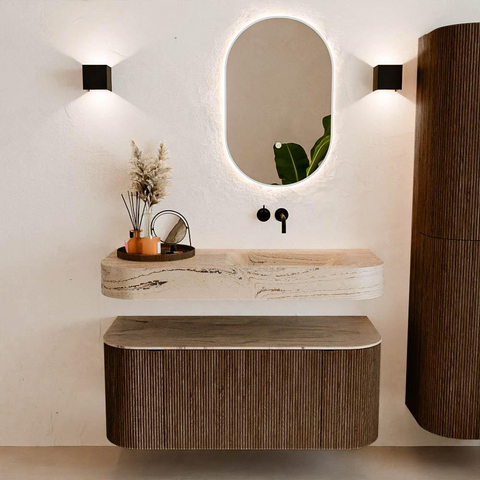 Natuurlijke materialen in warme tinten. De verticale ribbels brengen ritme en textuur in het ontwerp, terwijl het eikenhout zorgt voor een warme, ambachtelijke uitstraling. Kies uit 5 houttinten OAK, WALNUT, DUSK, SHADOW en RUBY zorgvuldig geselecteerde houtkleuren om zowel moderne als klassieke badkamers te verrijken.