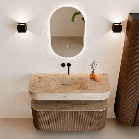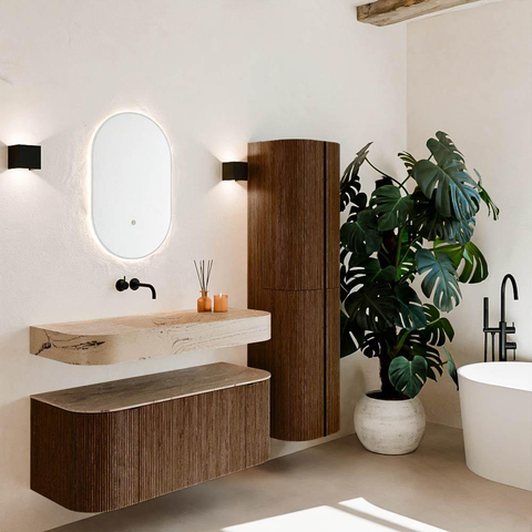 Natuurlijke materialen in warme tinten. De verticale ribbels brengen ritme en textuur in het ontwerp, terwijl het eikenhout zorgt voor een warme, ambachtelijke uitstraling. Kies uit 5 houttinten OAK, WALNUT, DUSK, SHADOW en RUBY zorgvuldig geselecteerde houtkleuren om zowel moderne als klassieke badkamers te verrijken.