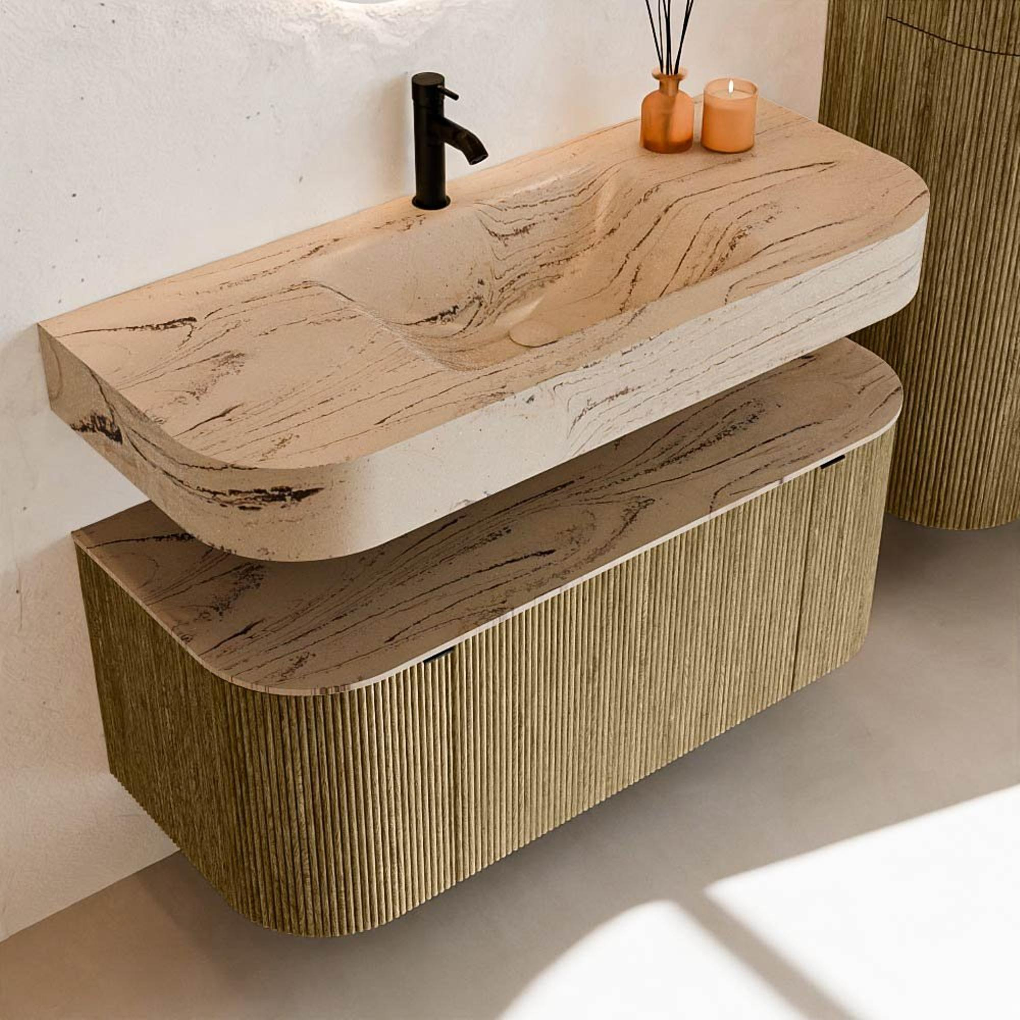 MONDIAZ THOR-DLUX 110cm badmeubel ronding links + rechts kleur Dusk met 1 lade en 2 deuren. Vrijhangende wastafel CLOUD Midden 1 kraangat kleur Arena.