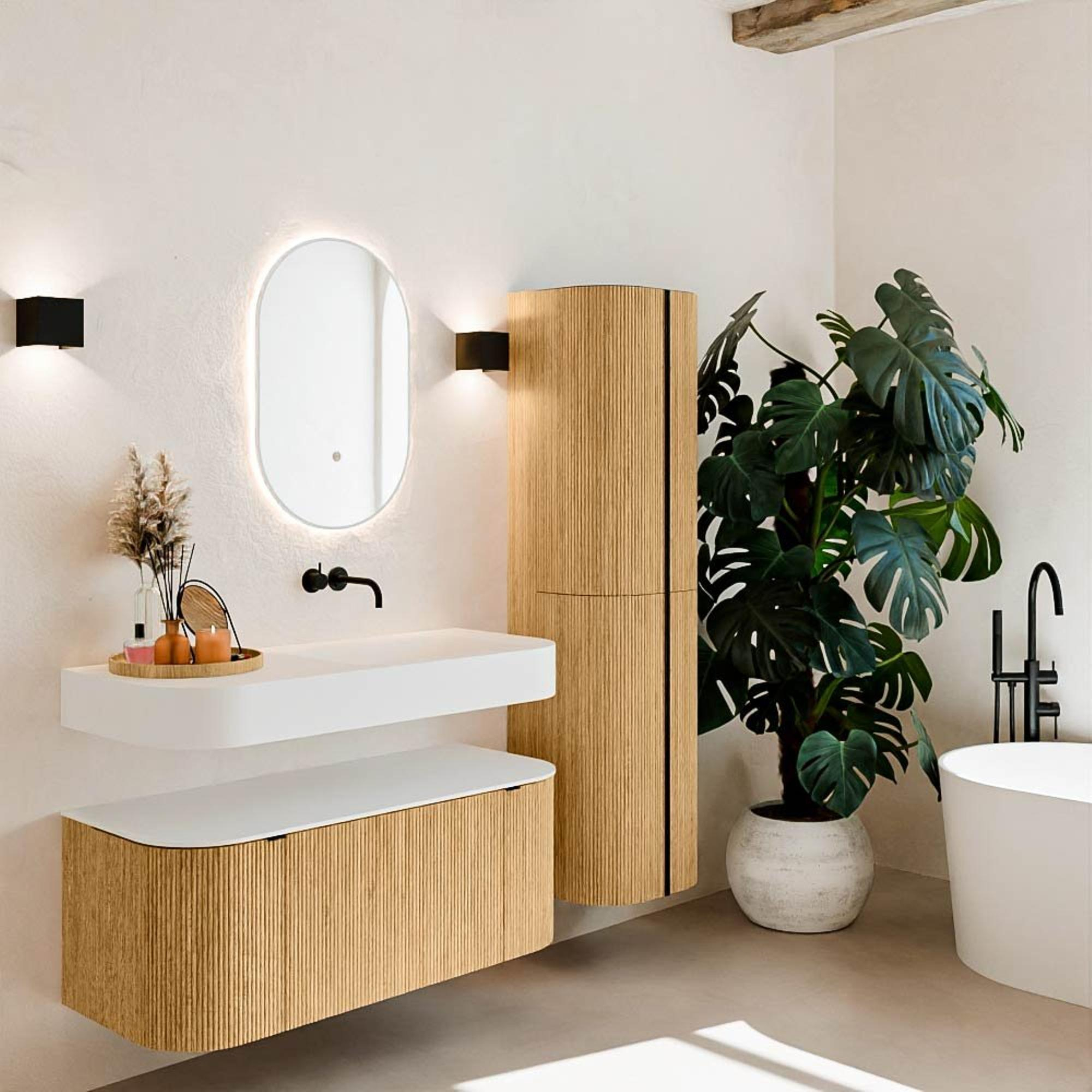 Natuurlijke materialen in warme tinten. De verticale ribbels brengen ritme en textuur in het ontwerp, terwijl het eikenhout zorgt voor een warme, ambachtelijke uitstraling. Kies uit 5 houttinten OAK, WALNUT, DUSK, SHADOW en RUBY zorgvuldig geselecteerde houtkleuren om zowel moderne als klassieke badkamers te verrijken.