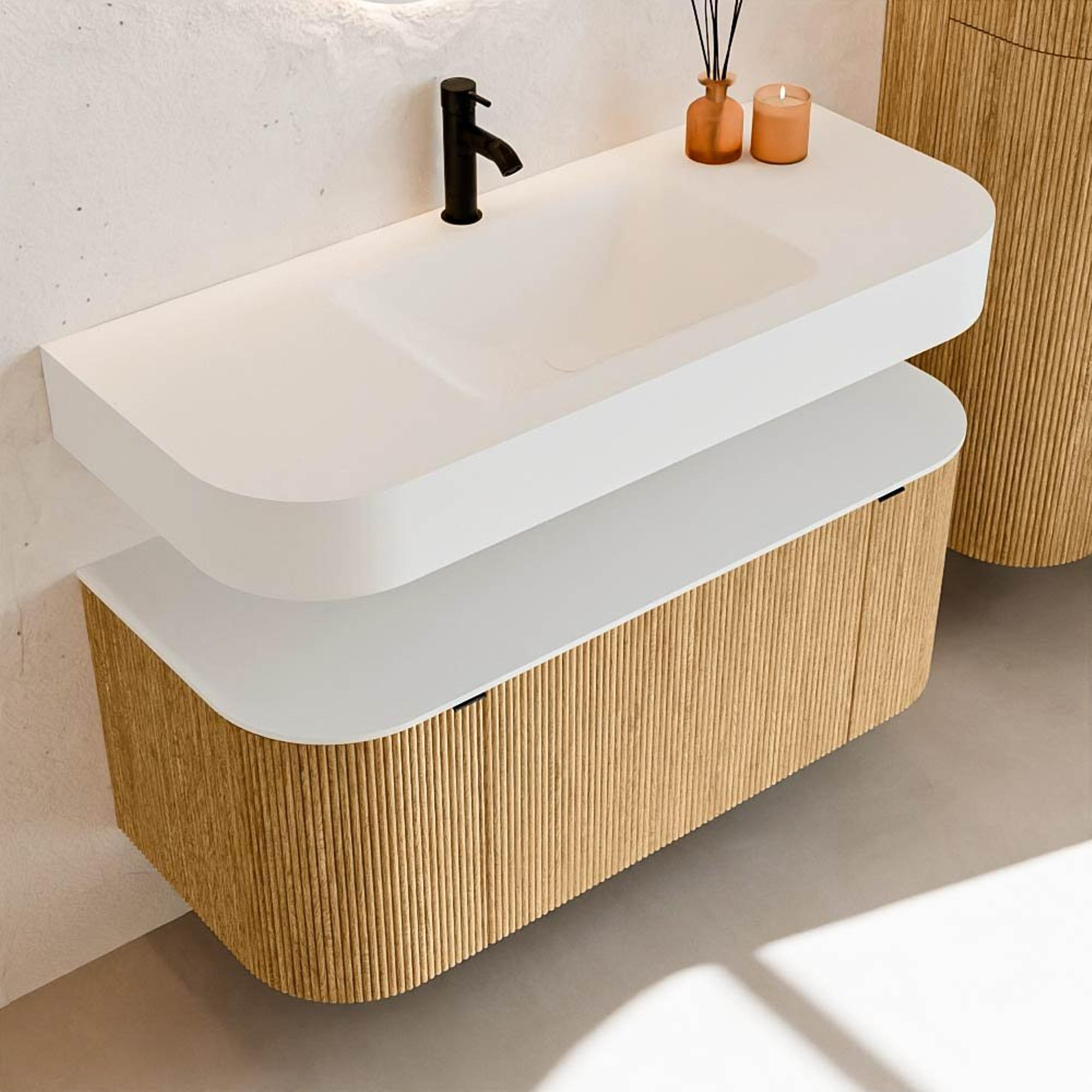 Boven het meubel zweeft een bijpassende, vrij hangende wastafel met afgeronde hoeken – perfect afgestemd op de vorm van de kast. De wastafel is uitgevoerd in Solid Surface en volgt subtiel de lijnen van het onderliggende meubel, waardoor een harmonieus geheel ontstaat. Het Solid Surface topblad vormt een sterke, onderhoudsvriendelijke basis en maakt de combinatie compleet.