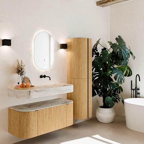 Natuurlijke materialen in warme tinten. De verticale ribbels brengen ritme en textuur in het ontwerp, terwijl het eikenhout zorgt voor een warme, ambachtelijke uitstraling. Kies uit 5 houttinten OAK, WALNUT, DUSK, SHADOW en RUBY zorgvuldig geselecteerde houtkleuren om zowel moderne als klassieke badkamers te verrijken.