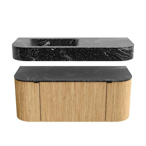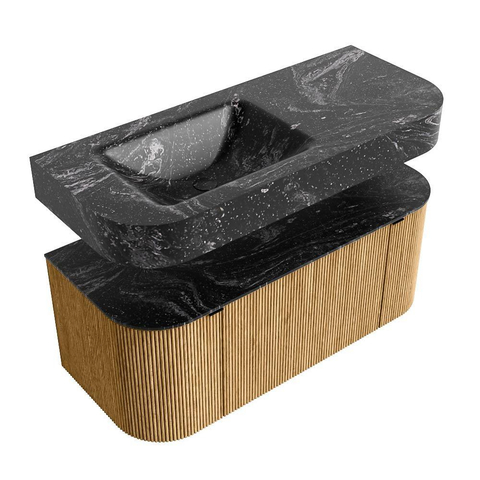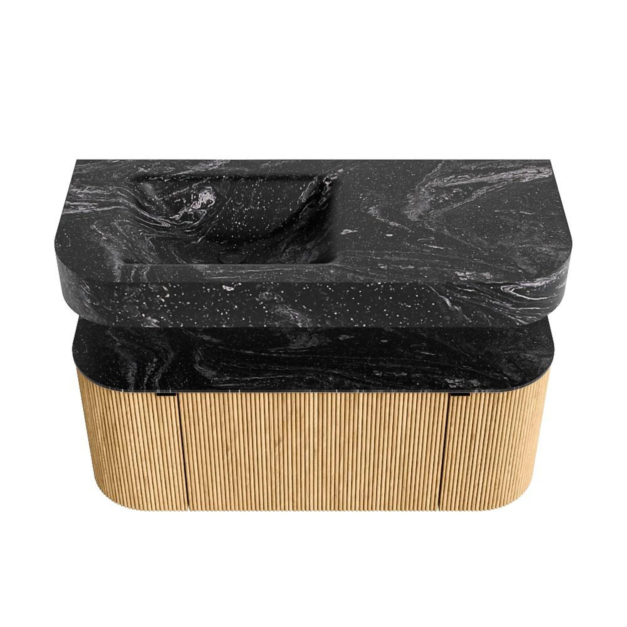 MONDIAZ THOR-DLUX 110cm badmeubel ronding links + rechts kleur Oak met 1 lade en 2 deuren. Vrijhangende wastafel CLOUD Links zonder kraangat kleur Lava.