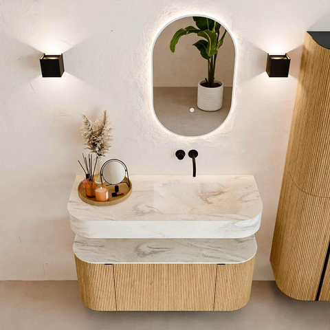 MONDIAZ THOR-DLUX 110cm badmeubel ronding links + rechts kleur Oak met 1 lade en 2 deuren. Vrijhangende wastafel CLOUD Rechts zonder kraangat kleur Ostra.