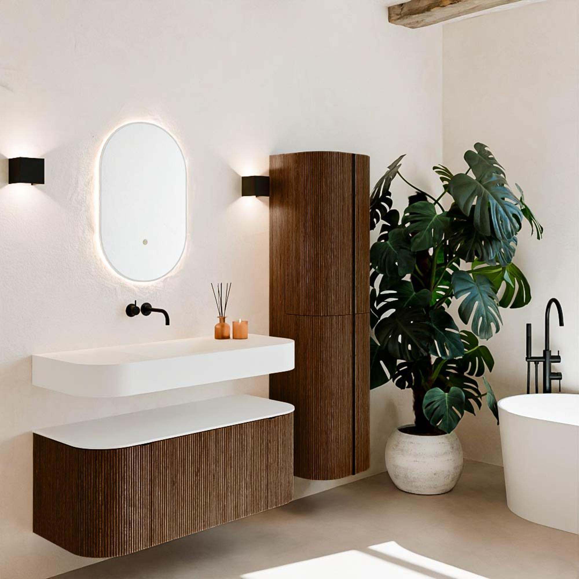 Natuurlijke materialen in warme tinten. De verticale ribbels brengen ritme en textuur in het ontwerp, terwijl het eikenhout zorgt voor een warme, ambachtelijke uitstraling. Kies uit 5 houttinten OAK, WALNUT, DUSK, SHADOW en RUBY zorgvuldig geselecteerde houtkleuren om zowel moderne als klassieke badkamers te verrijken.