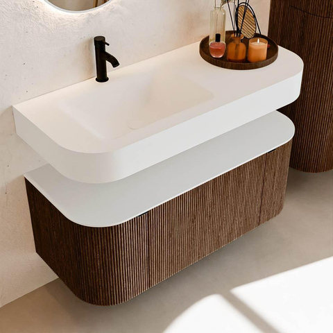Boven het meubel zweeft een bijpassende, vrij hangende wastafel met afgeronde hoeken – perfect afgestemd op de vorm van de kast. De wastafel is uitgevoerd in Solid Surface en volgt subtiel de lijnen van het onderliggende meubel, waardoor een harmonieus geheel ontstaat. Het Solid Surface topblad vormt een sterke, onderhoudsvriendelijke basis en maakt de combinatie compleet.