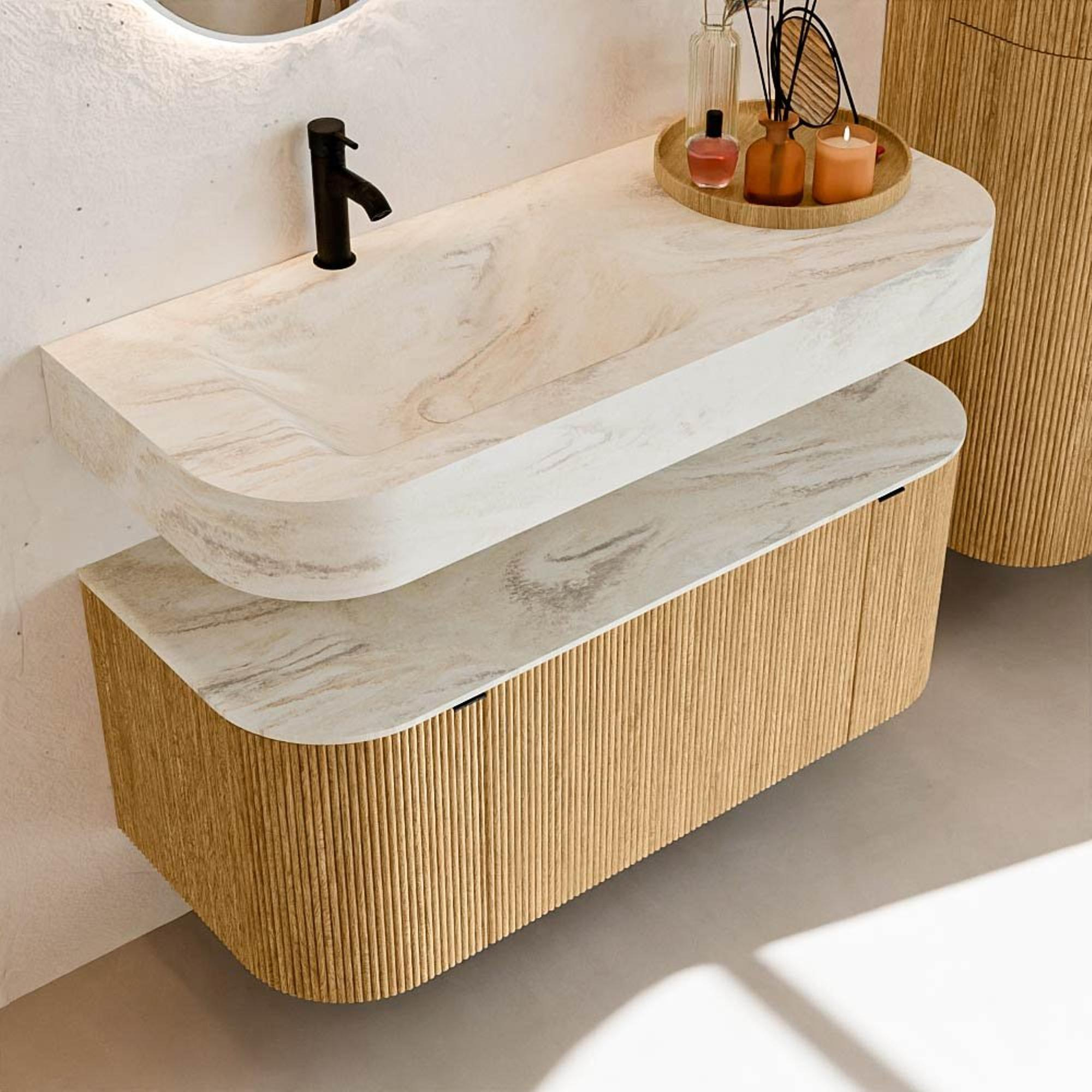 MONDIAZ THOR-DLUX 110cm badmeubel ronding links + rechts kleur Oak met 1 lade en 2 deuren. Vrijhangende wastafel CLOUD Links 1 kraangat kleur Ostra.