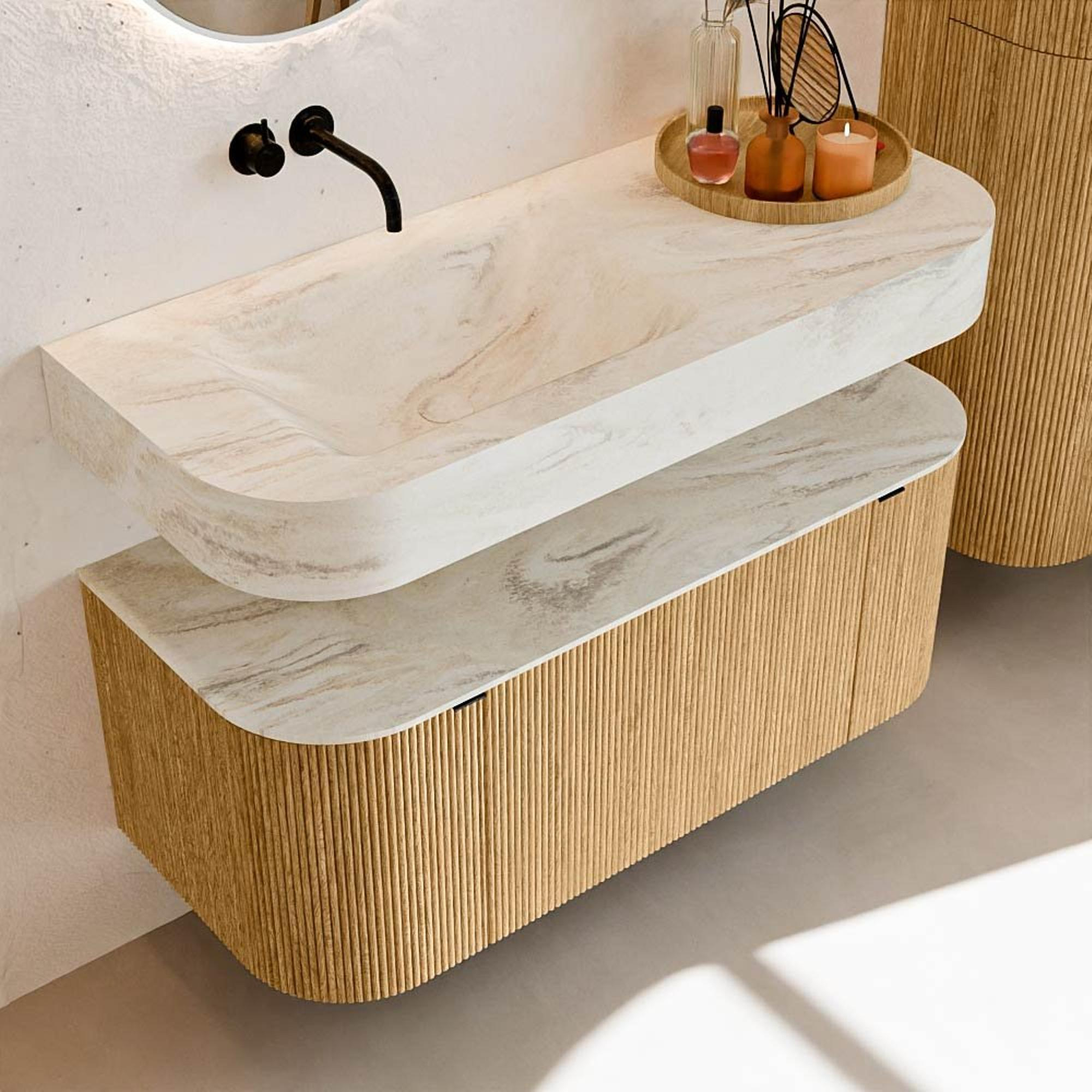 Boven het meubel zweeft een bijpassende, vrij hangende wastafel met afgeronde hoeken – perfect afgestemd op de vorm van de kast. De wastafel is uitgevoerd in Solid Surface en volgt subtiel de lijnen van het onderliggende meubel, waardoor een harmonieus geheel ontstaat. Het Solid Surface topblad vormt een sterke, onderhoudsvriendelijke basis en maakt de combinatie compleet.