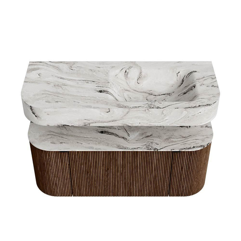 MONDIAZ THOR-DLUX 110cm badmeubel ronding links + rechts kleur Walnut met 1 lade en 2 deuren. Vrijhangende wastafel CLOUD Rechts 1 kraangat kleur Glace.