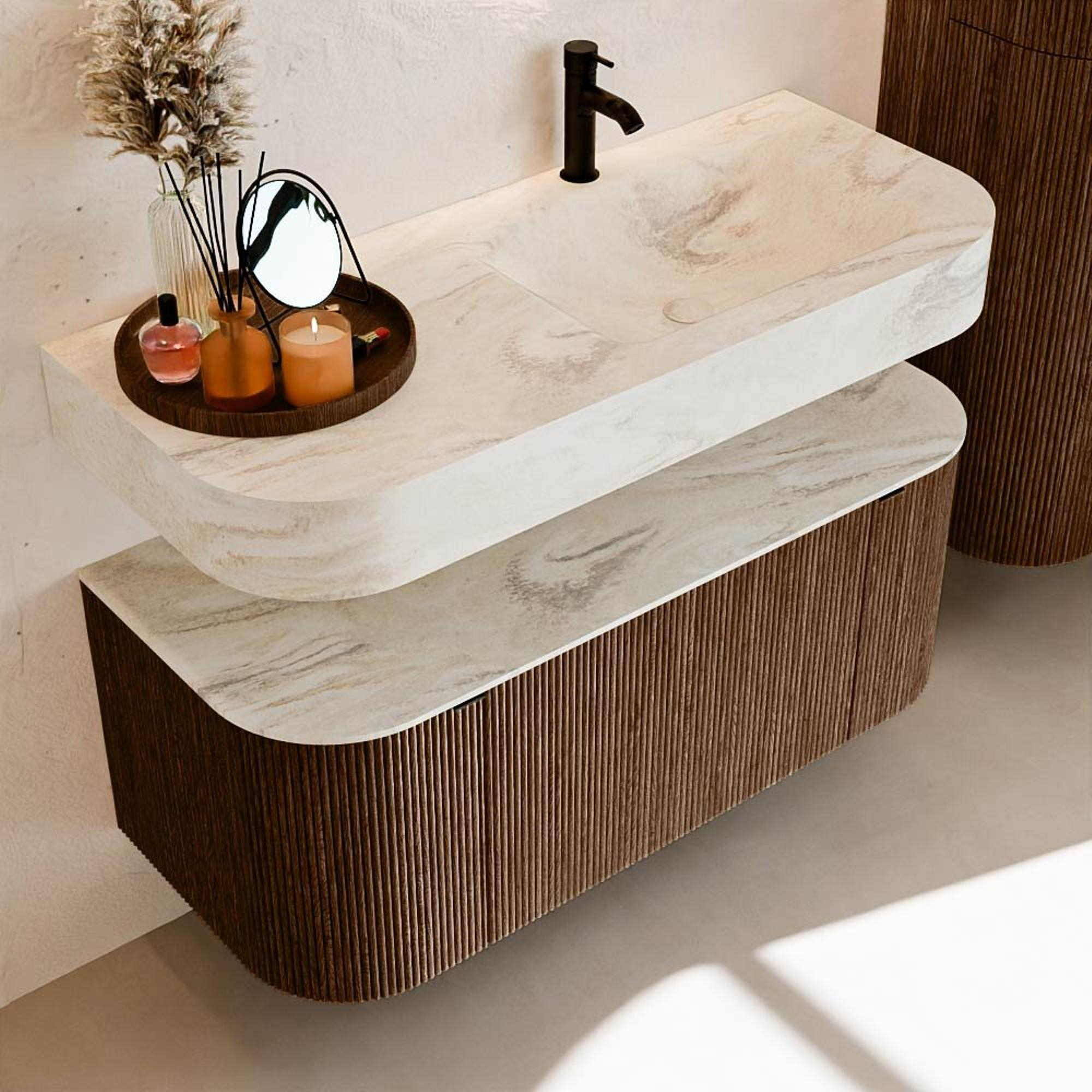 MONDIAZ THOR-DLUX 110cm badmeubel ronding links + rechts kleur Walnut met 1 lade en 2 deuren. Vrijhangende wastafel CLOUD Rechts 1 kraangat kleur Ostra.
