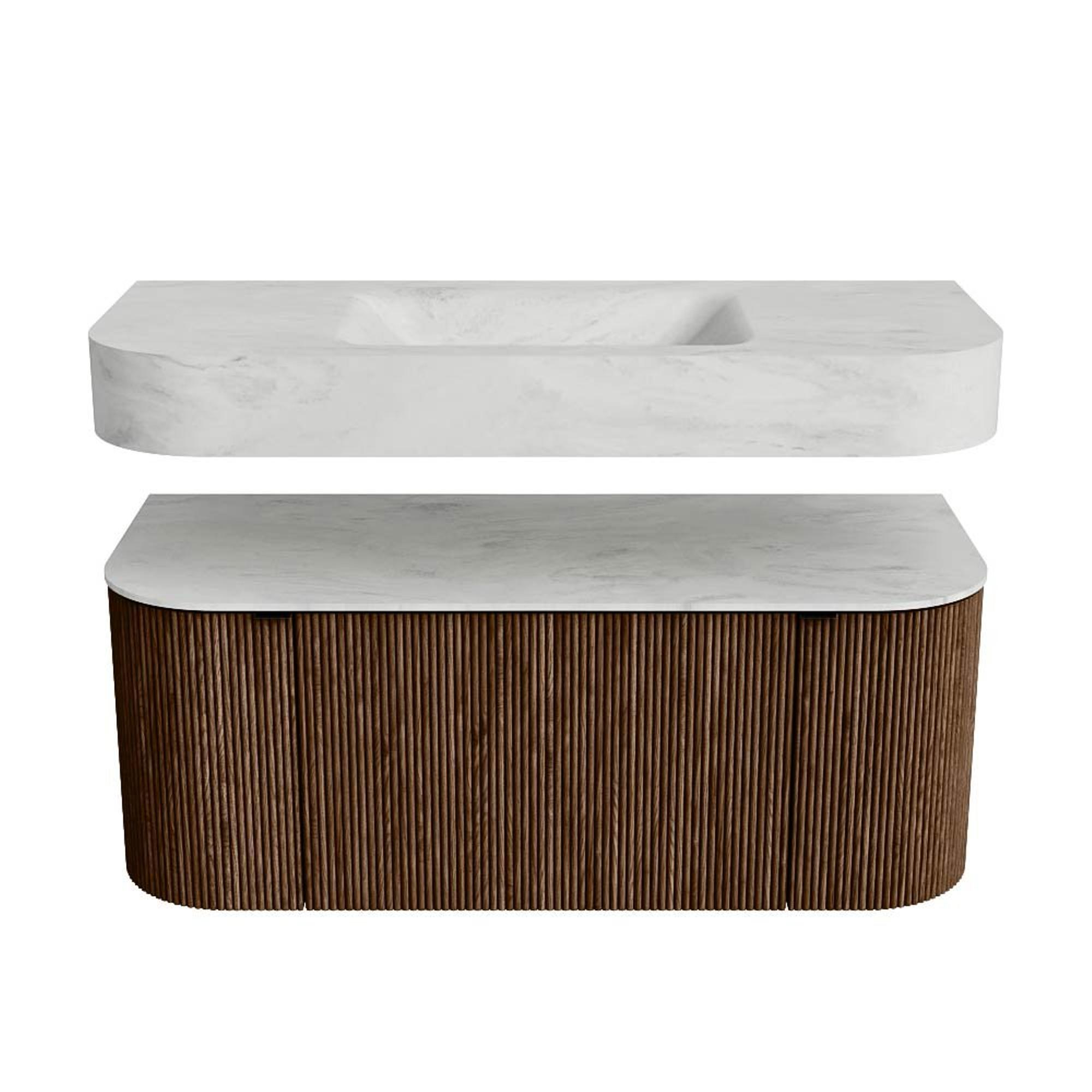 Boven het meubel zweeft een bijpassende, vrij hangende wastafel met afgeronde hoeken – perfect afgestemd op de vorm van de kast. De wastafel is uitgevoerd in Solid Surface en volgt subtiel de lijnen van het onderliggende meubel, waardoor een harmonieus geheel ontstaat. Het Solid Surface topblad vormt een sterke, onderhoudsvriendelijke basis en maakt de combinatie compleet.