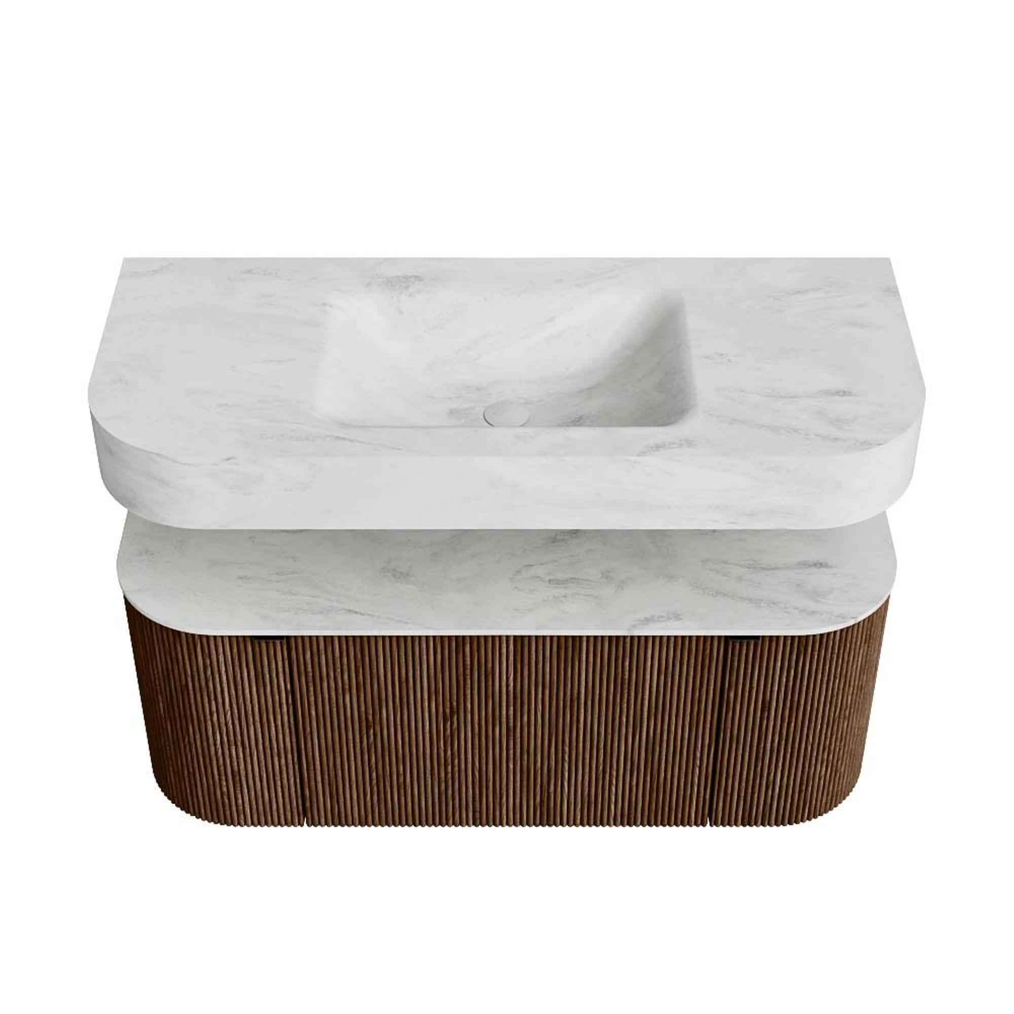 MONDIAZ THOR-DLUX 110cm badmeubel ronding links + rechts kleur Walnut met 1 lade en 2 deuren. Vrijhangende wastafel CLOUD Midden 1 kraangat kleur Opalo.