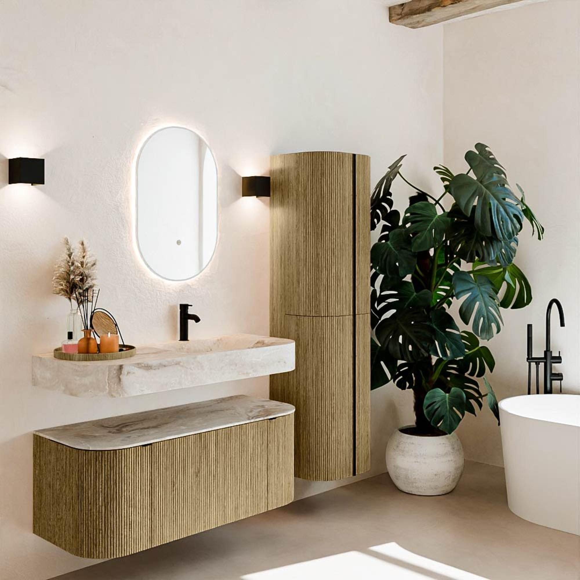 Natuurlijke materialen in warme tinten. De verticale ribbels brengen ritme en textuur in het ontwerp, terwijl het eikenhout zorgt voor een warme, ambachtelijke uitstraling. Kies uit 5 houttinten OAK, WALNUT, DUSK, SHADOW en RUBY zorgvuldig geselecteerde houtkleuren om zowel moderne als klassieke badkamers te verrijken.