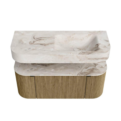 Boven het meubel zweeft een bijpassende, vrij hangende wastafel met afgeronde hoeken – perfect afgestemd op de vorm van de kast. De wastafel is uitgevoerd in Solid Surface en volgt subtiel de lijnen van het onderliggende meubel, waardoor een harmonieus geheel ontstaat. Het Solid Surface topblad vormt een sterke, onderhoudsvriendelijke basis en maakt de combinatie compleet.