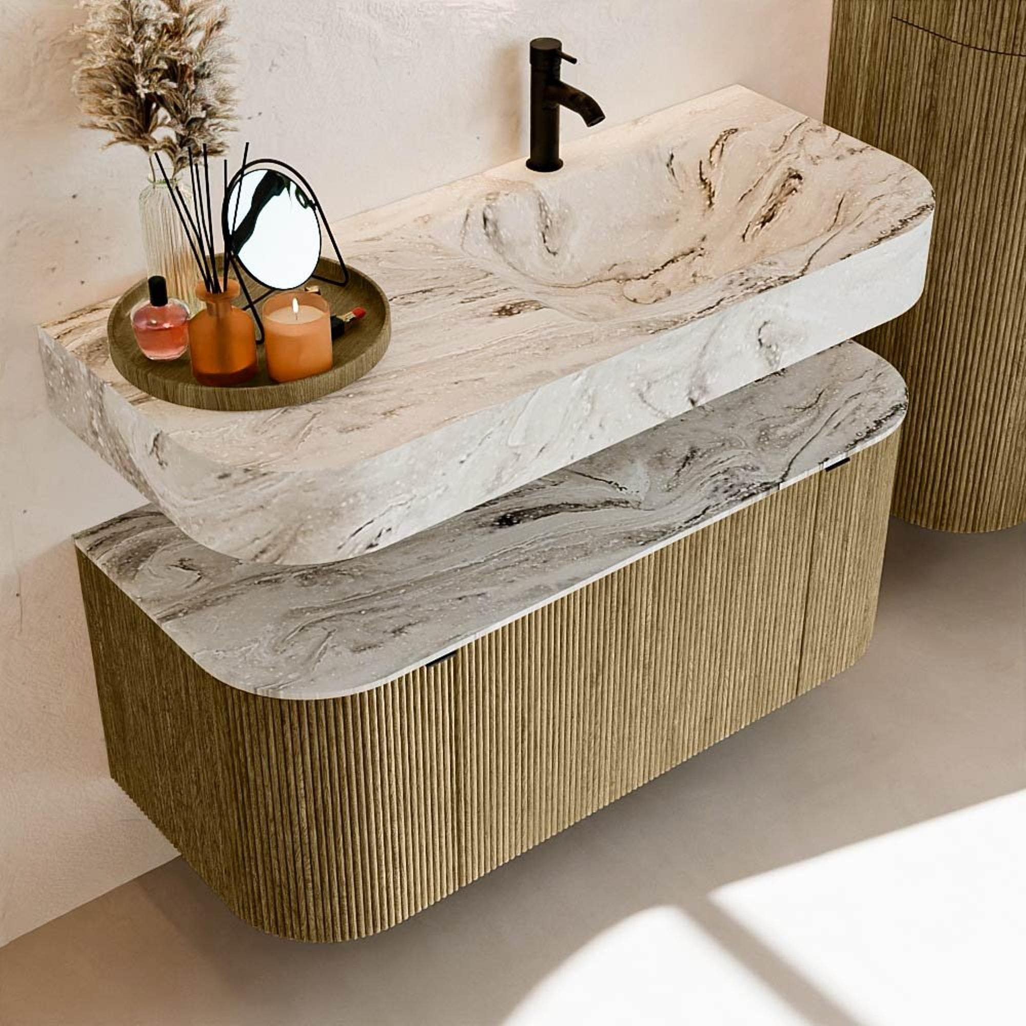 MONDIAZ THOR-DLUX 110cm badmeubel ronding links + rechts kleur Dusk met 1 lade en 2 deuren. Vrijhangende wastafel CLOUD Rechts 1 kraangat kleur Glace.