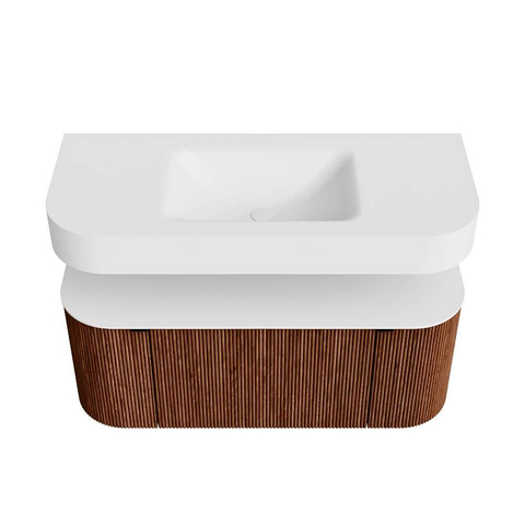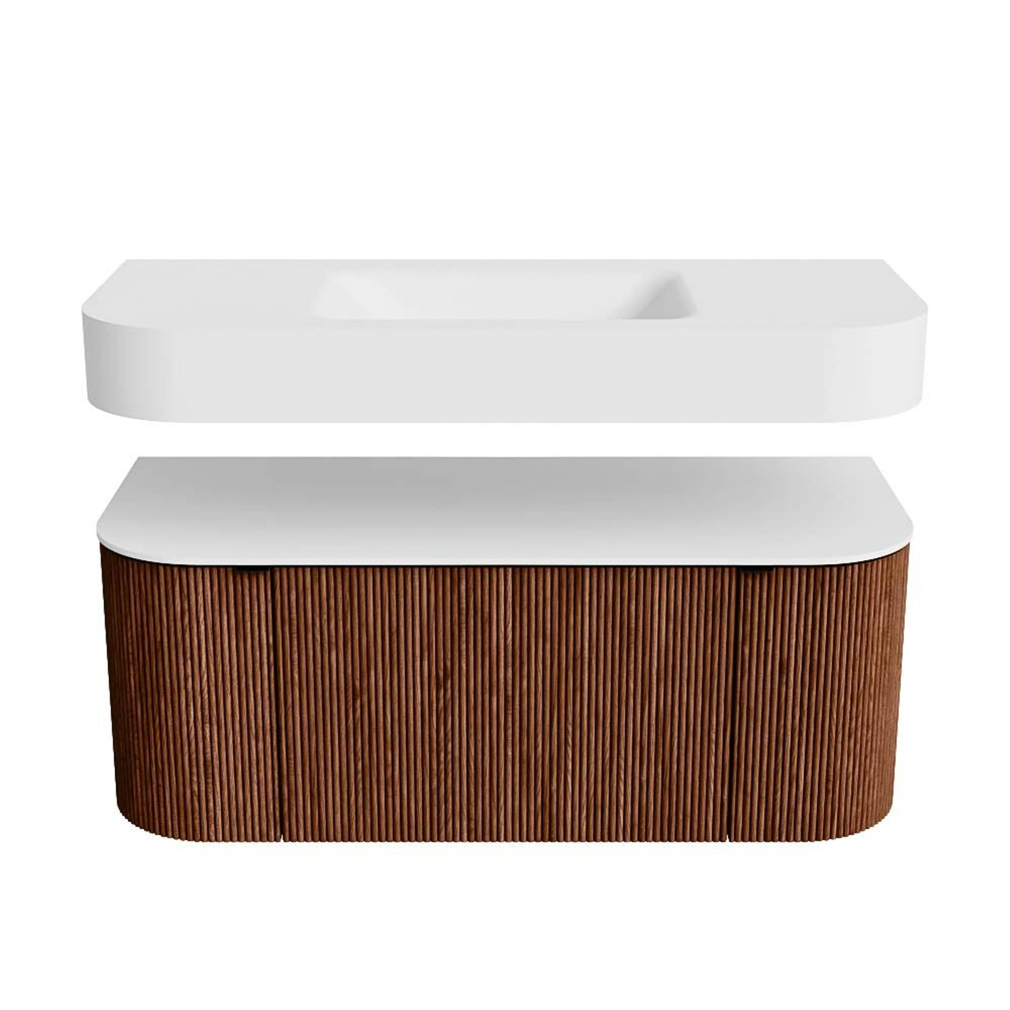 Boven het meubel zweeft een bijpassende, vrij hangende wastafel met afgeronde hoeken – perfect afgestemd op de vorm van de kast. De wastafel is uitgevoerd in Solid Surface en volgt subtiel de lijnen van het onderliggende meubel, waardoor een harmonieus geheel ontstaat. Het Solid Surface topblad vormt een sterke, onderhoudsvriendelijke basis en maakt de combinatie compleet.