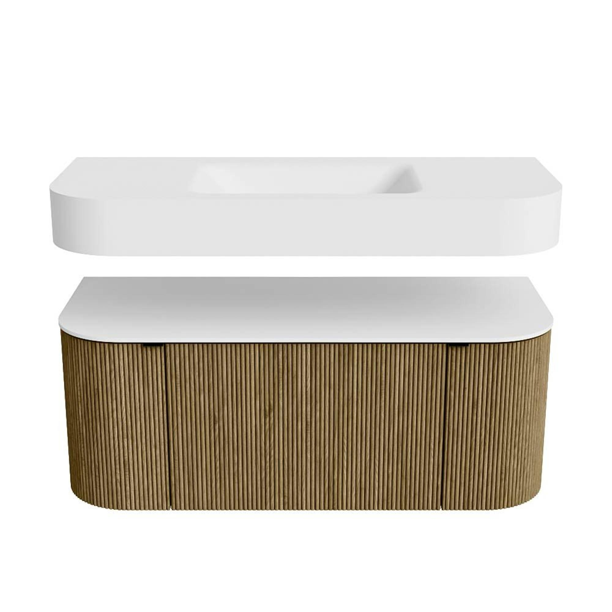 Boven het meubel zweeft een bijpassende, vrij hangende wastafel met afgeronde hoeken – perfect afgestemd op de vorm van de kast. De wastafel is uitgevoerd in Solid Surface en volgt subtiel de lijnen van het onderliggende meubel, waardoor een harmonieus geheel ontstaat. Het Solid Surface topblad vormt een sterke, onderhoudsvriendelijke basis en maakt de combinatie compleet.