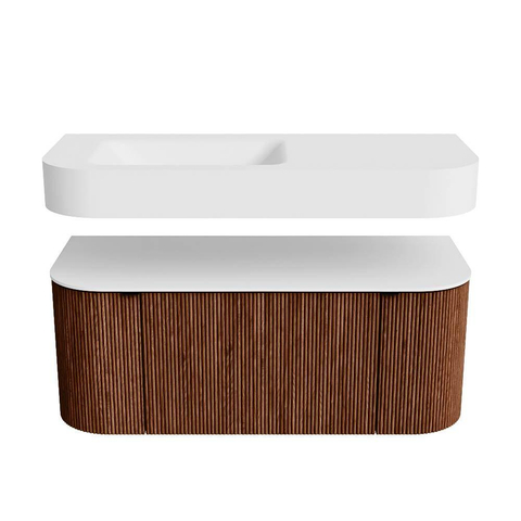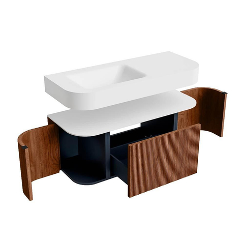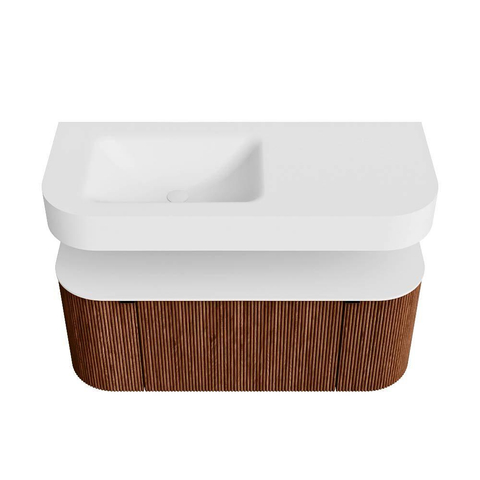 Boven het meubel zweeft een bijpassende, vrij hangende wastafel met afgeronde hoeken – perfect afgestemd op de vorm van de kast. De wastafel is uitgevoerd in Solid Surface en volgt subtiel de lijnen van het onderliggende meubel, waardoor een harmonieus geheel ontstaat. Het Solid Surface topblad vormt een sterke, onderhoudsvriendelijke basis en maakt de combinatie compleet.