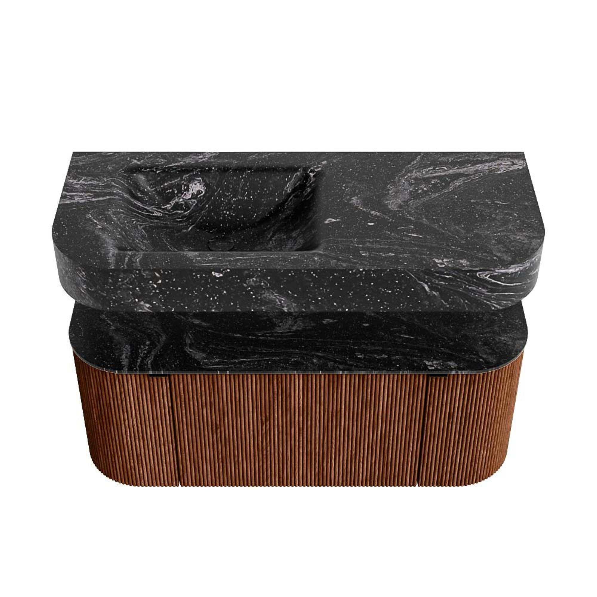 MONDIAZ THOR-DLUX 110cm badmeubel ronding links + rechts kleur Ruby met 1 lade en 2 deuren. Vrijhangende wastafel CLOUD Links zonder kraangat kleur Lava.