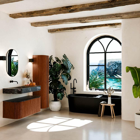 Natuurlijke materialen in warme tinten. De verticale ribbels brengen ritme en textuur in het ontwerp, terwijl het eikenhout zorgt voor een warme, ambachtelijke uitstraling. Kies uit 5 houttinten OAK, WALNUT, DUSK, SHADOW en RUBY zorgvuldig geselecteerde houtkleuren om zowel moderne als klassieke badkamers te verrijken.
