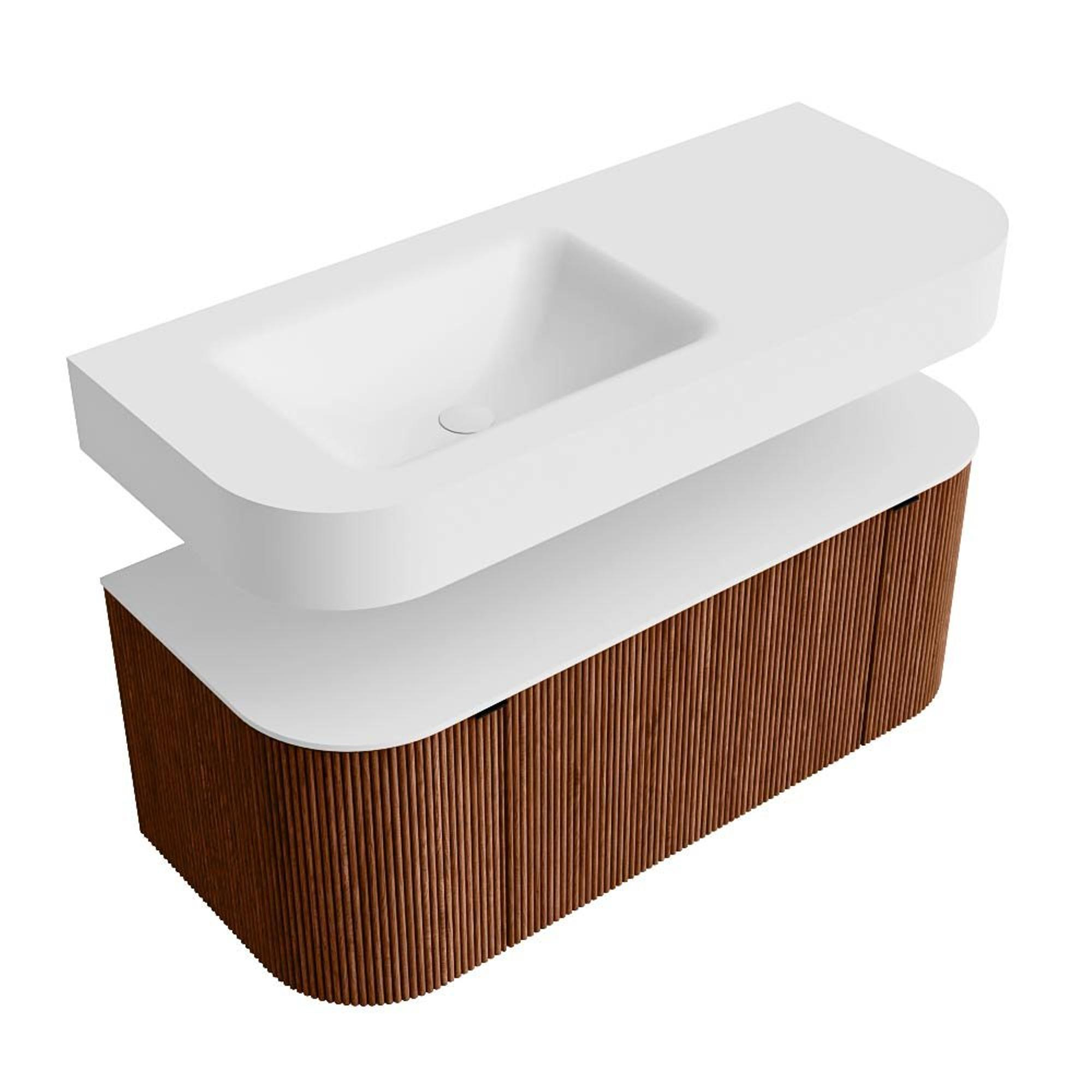 Boven het meubel zweeft een bijpassende, vrij hangende wastafel met afgeronde hoeken – perfect afgestemd op de vorm van de kast. De wastafel is uitgevoerd in Solid Surface en volgt subtiel de lijnen van het onderliggende meubel, waardoor een harmonieus geheel ontstaat. Het Solid Surface topblad vormt een sterke, onderhoudsvriendelijke basis en maakt de combinatie compleet.