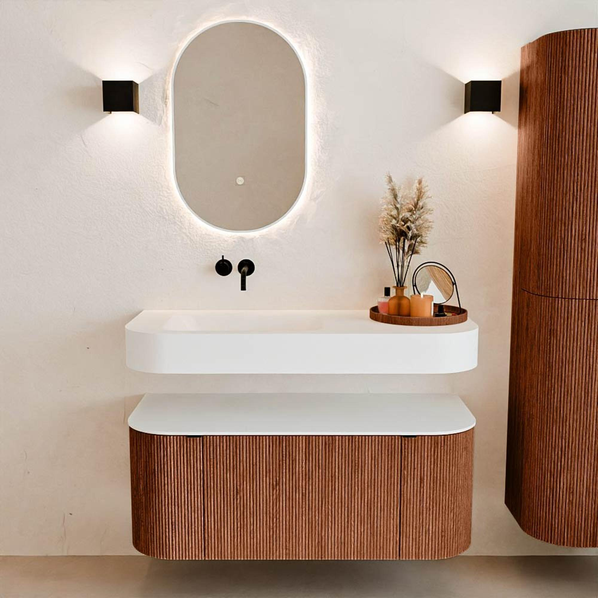 Natuurlijke materialen in warme tinten. De verticale ribbels brengen ritme en textuur in het ontwerp, terwijl het eikenhout zorgt voor een warme, ambachtelijke uitstraling. Kies uit 5 houttinten OAK, WALNUT, DUSK, SHADOW en RUBY zorgvuldig geselecteerde houtkleuren om zowel moderne als klassieke badkamers te verrijken.