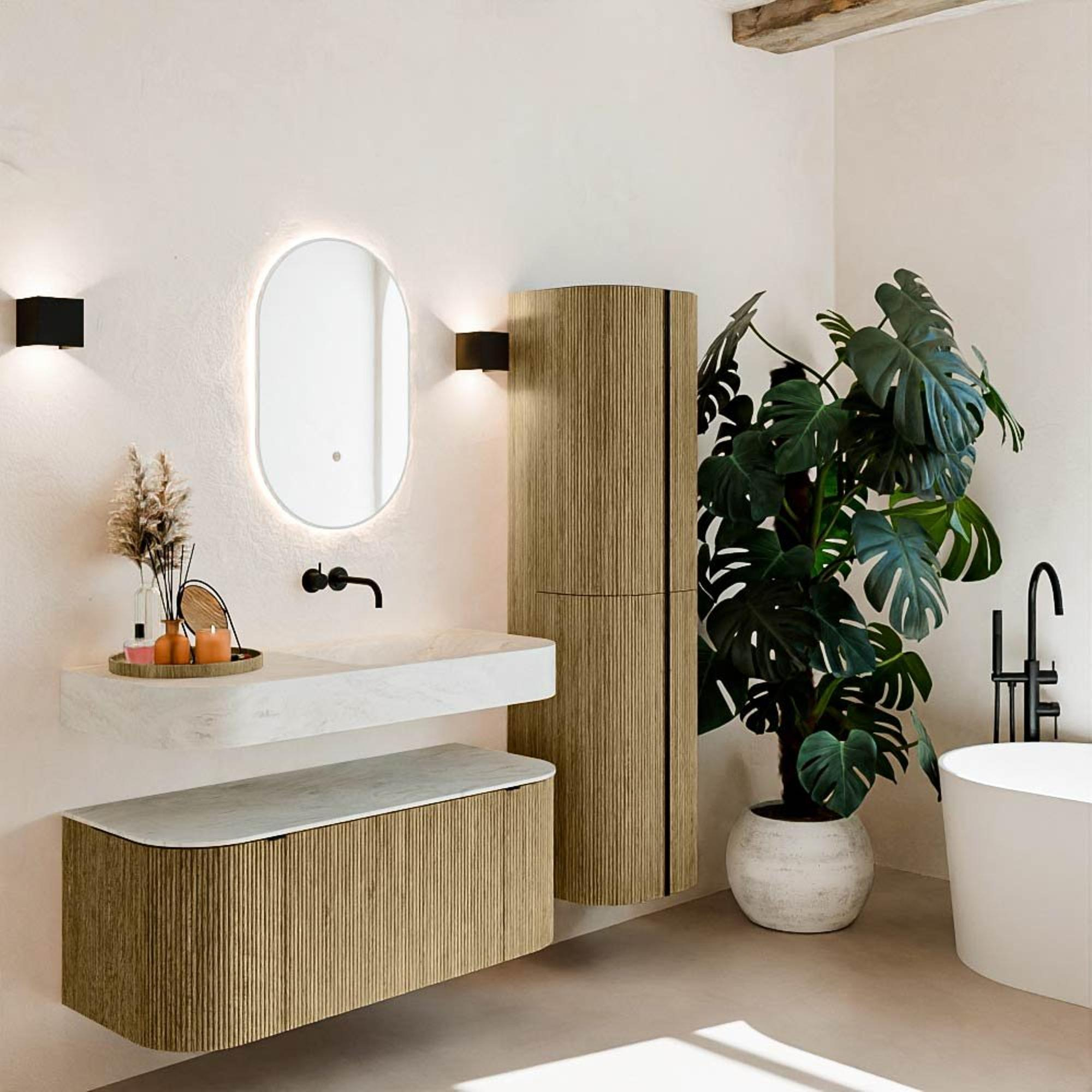 Natuurlijke materialen in warme tinten. De verticale ribbels brengen ritme en textuur in het ontwerp, terwijl het eikenhout zorgt voor een warme, ambachtelijke uitstraling. Kies uit 5 houttinten OAK, WALNUT, DUSK, SHADOW en RUBY zorgvuldig geselecteerde houtkleuren om zowel moderne als klassieke badkamers te verrijken.