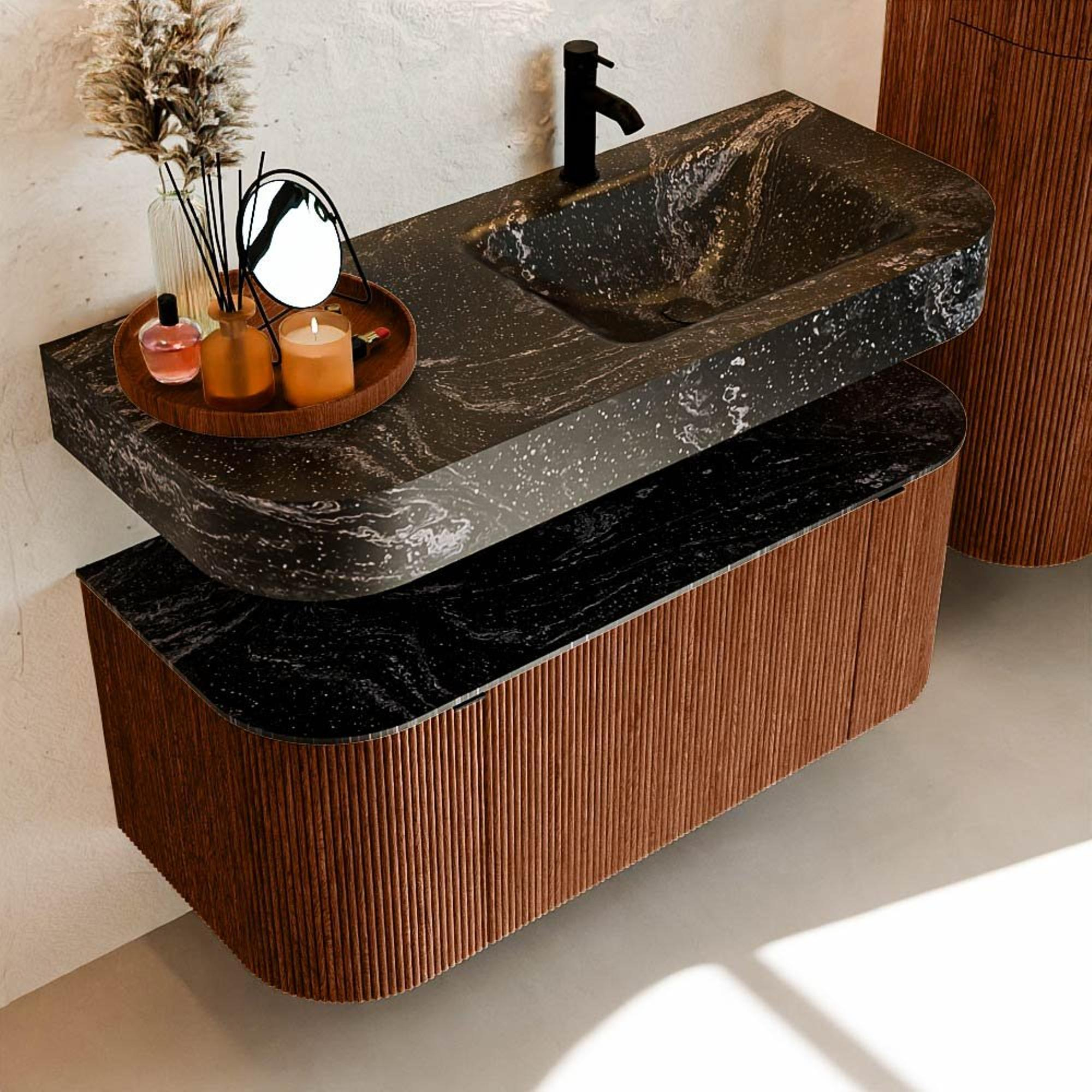 MONDIAZ THOR-DLUX 110cm badmeubel ronding links + rechts kleur Ruby met 1 lade en 2 deuren. Vrijhangende wastafel CLOUD Rechts 1 kraangat kleur Lava.