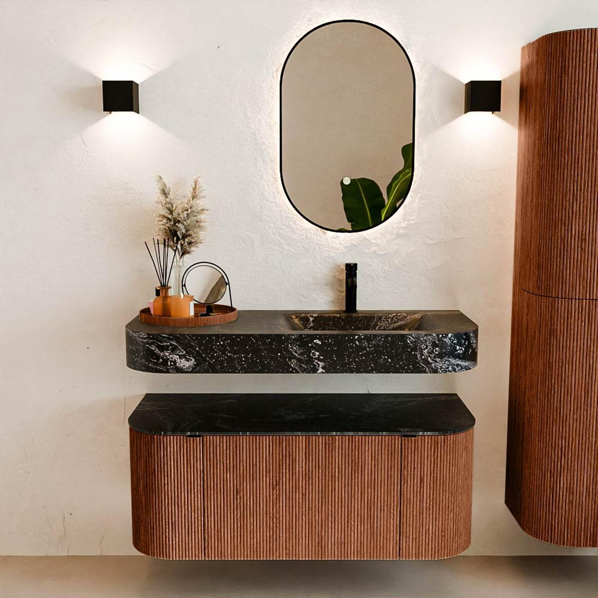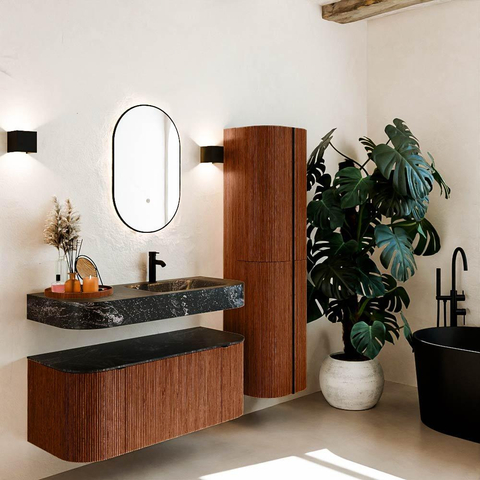 Natuurlijke materialen in warme tinten. De verticale ribbels brengen ritme en textuur in het ontwerp, terwijl het eikenhout zorgt voor een warme, ambachtelijke uitstraling. Kies uit 5 houttinten OAK, WALNUT, DUSK, SHADOW en RUBY zorgvuldig geselecteerde houtkleuren om zowel moderne als klassieke badkamers te verrijken.