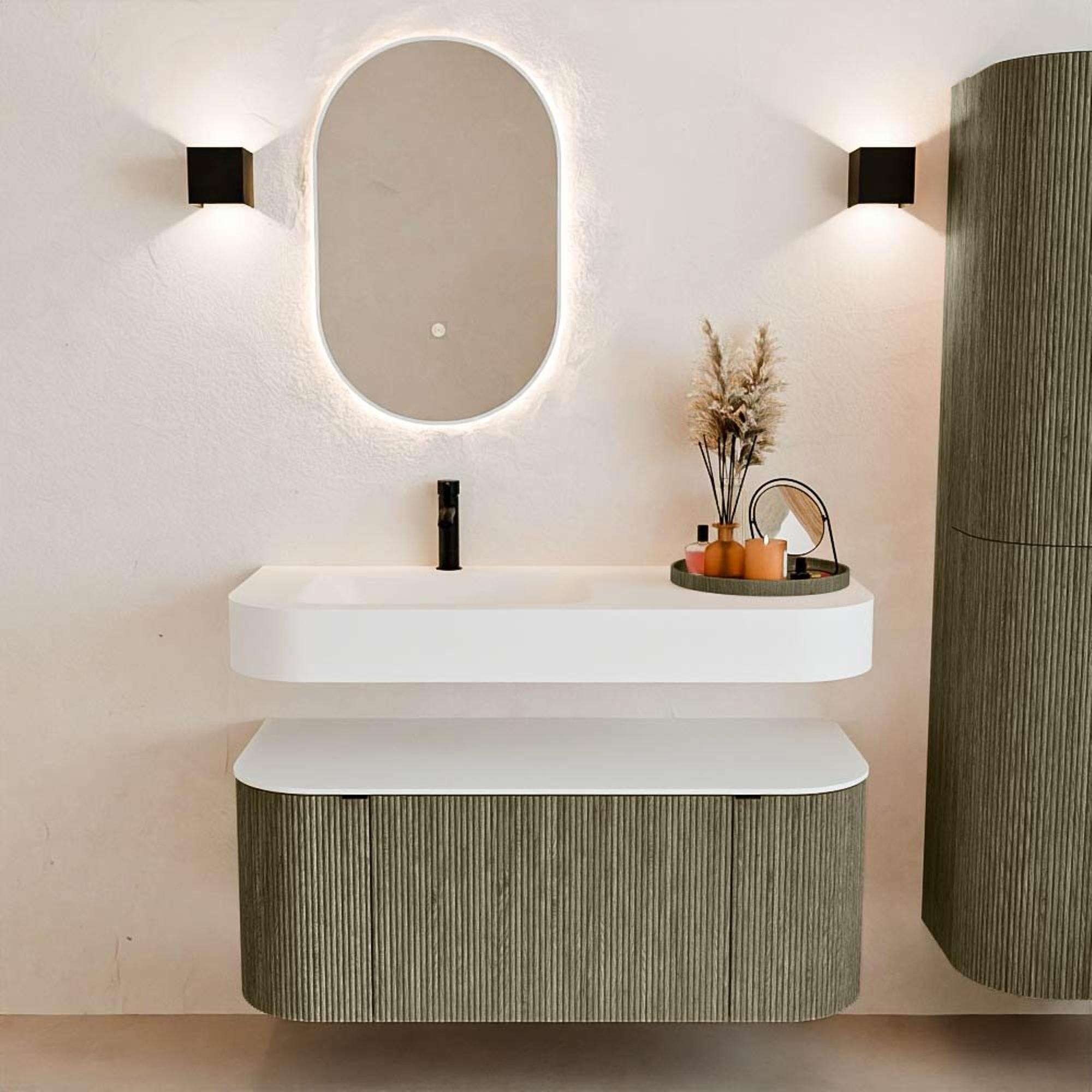 Boven het meubel zweeft een bijpassende, vrij hangende wastafel met afgeronde hoeken – perfect afgestemd op de vorm van de kast. De wastafel is uitgevoerd in Solid Surface en volgt subtiel de lijnen van het onderliggende meubel, waardoor een harmonieus geheel ontstaat. Het Solid Surface topblad vormt een sterke, onderhoudsvriendelijke basis en maakt de combinatie compleet.