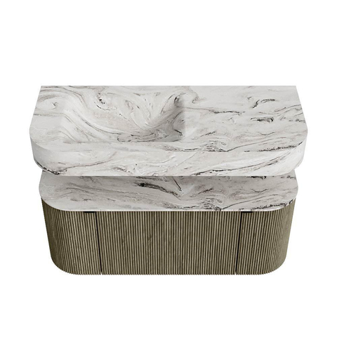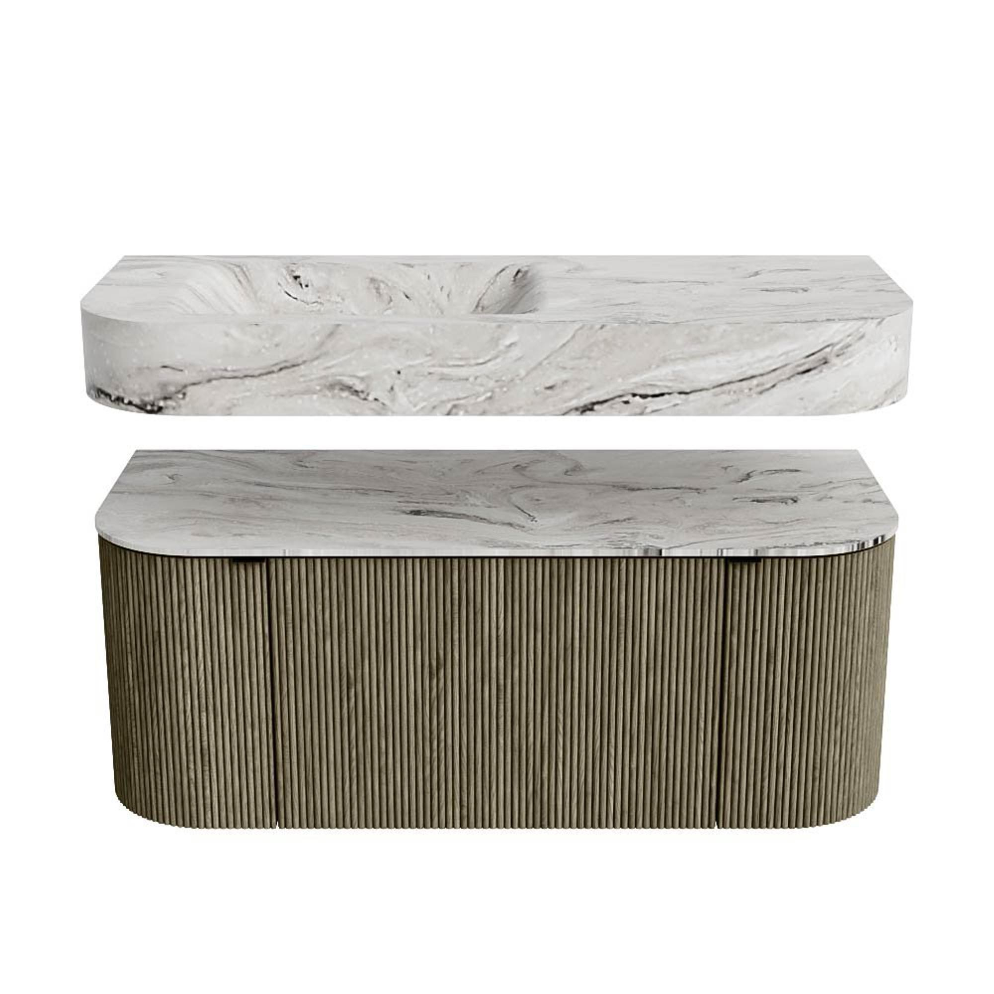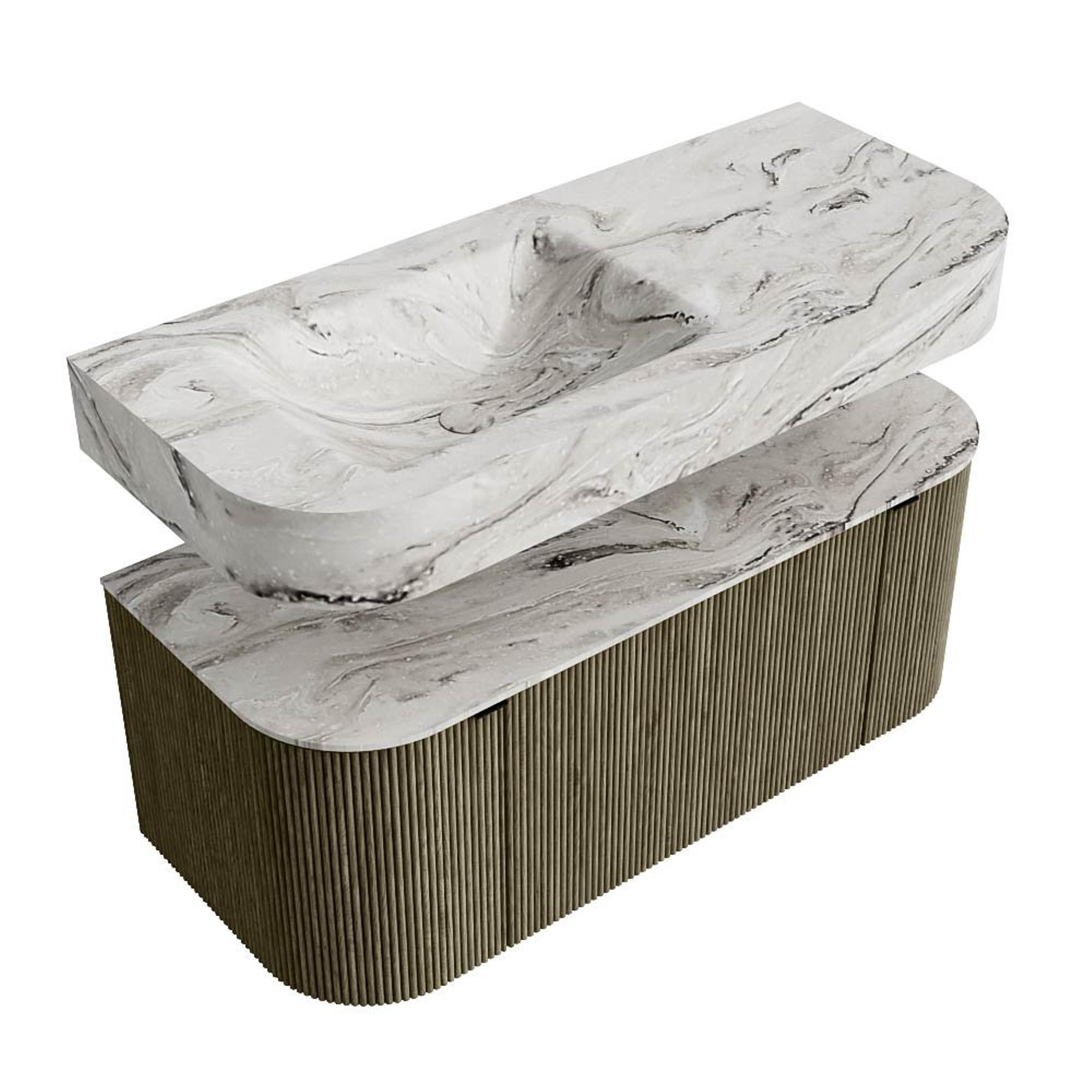 MONDIAZ THOR-DLUX 110cm badmeubel ronding links + rechts kleur Shadow met 1 lade en 2 deuren. Vrijhangende wastafel CLOUD Links zonder kraangat kleur Glace.